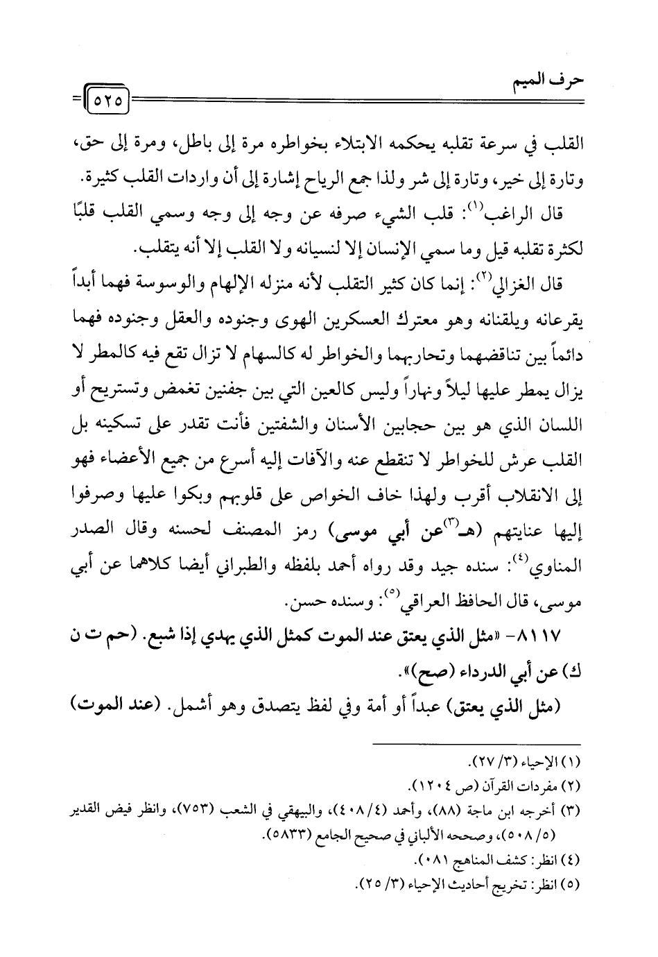 قال الغزالي (¬2): إنما كان كثير التقلب لأنه منزله الإلهام والوسوسة فهما أبداً يقرعانه ويلقنانه وهو معترك العسكرين الهوى وجنوده والعقل وجنوده فهما دائماً بين تناقضهما وتحاربهما والخواطر له كالسهام لا تزال تقع فيه كالمطر لا يزال يمطر عليها ليلاً ونهاراً وليس كالعين التي بين جفنين تغمض وتستريح أو اللسان الذي هو بين حجابين الأسنان والشفتين فأنت تقدر على تسكينه بل القلب عرش للخواطر لا تنقطع عنه والآفات إليه أسرع من جميع الأعضاء فهو إلى الانقلاب أقرب ولهذا خاف الخواص على قلوبهم وبكوا عليها وصرفوا إليها عنايتهم (هـ (¬3) عن أبي موسى) رمز المصنف لحسنه وقال الصدر المناوي (¬4): سنده جيد وقد رواه أحمد بلفظه والطبراني أيضاً كلاهما عن أبي موسى، قال الحافظ العراقي (¬5): وسنده حسن.