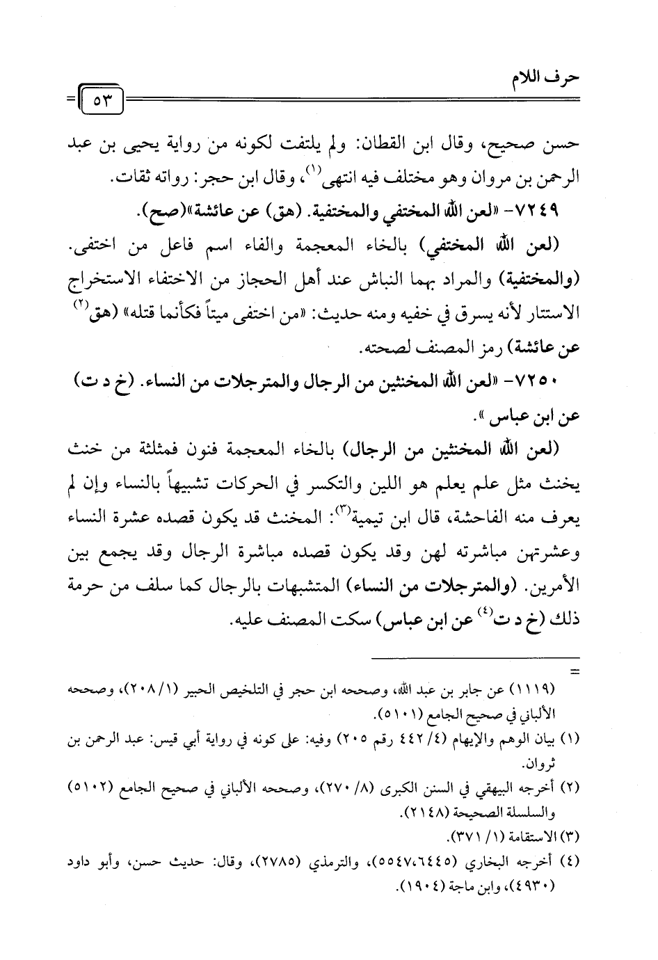 7249 - "لعن الله المختفي والمختفية. (هق) عن عائشة" (صح).