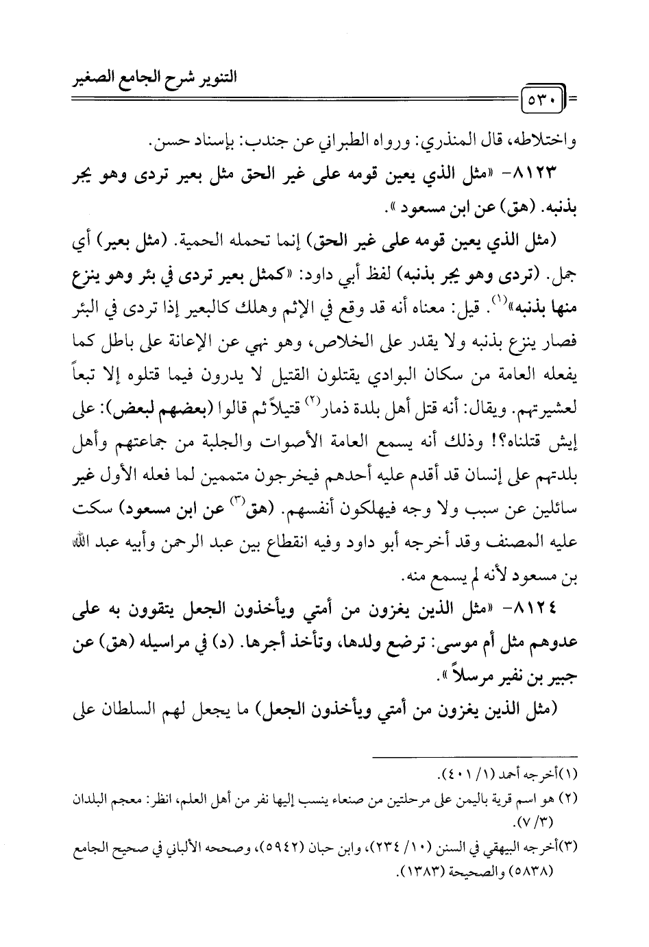 8123 - "مثل الذي يعين قومه على غير الحق مثل بعير تردى وهو يجر بذنبه. (هق) عن ابن مسعود".