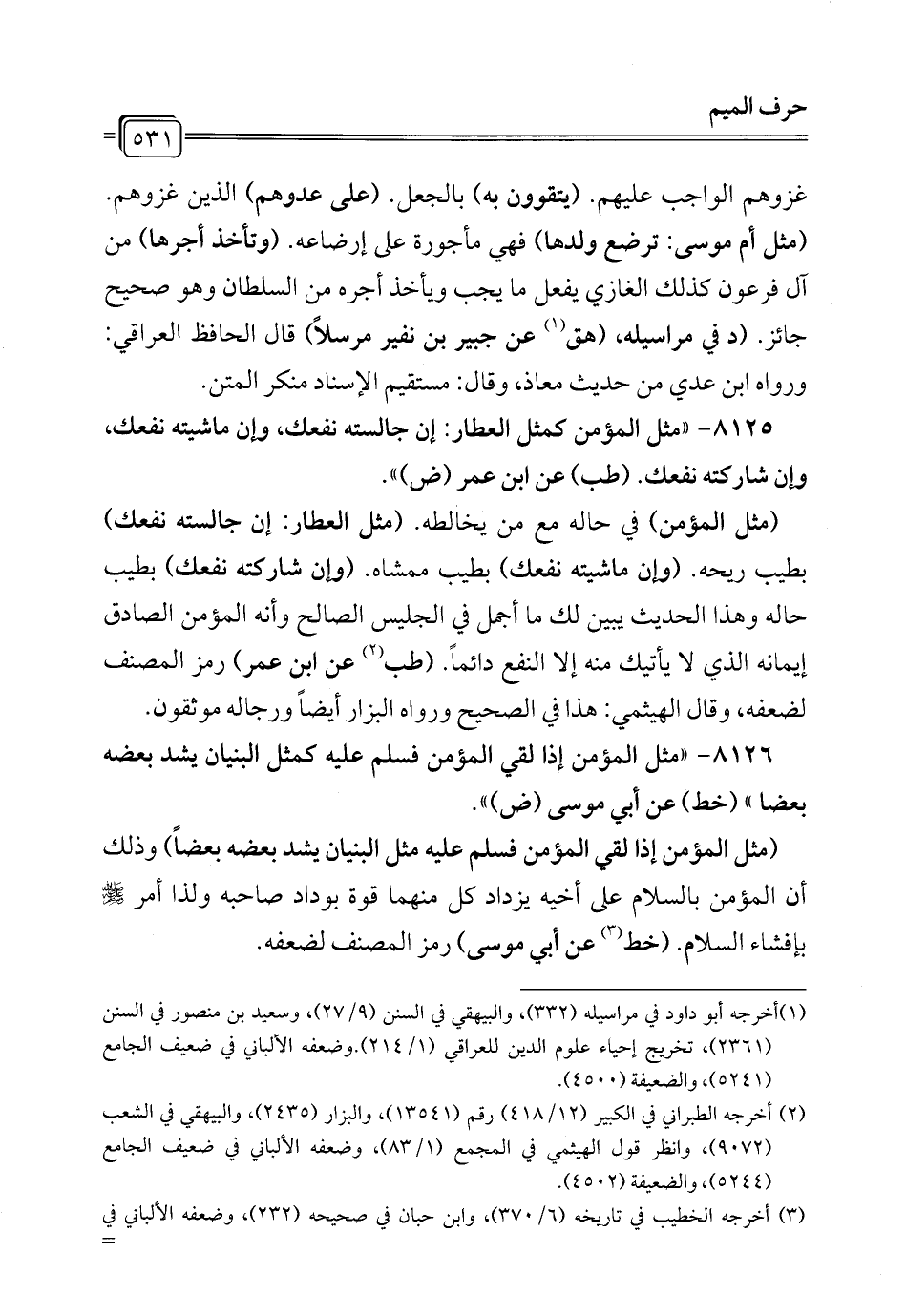 8126 - "مثل المؤمن إذا لقي المؤمن فسلم عليه كمثل البنيان يشد بعضه بعضا" (خط) عن أبي موسى (ض) ".