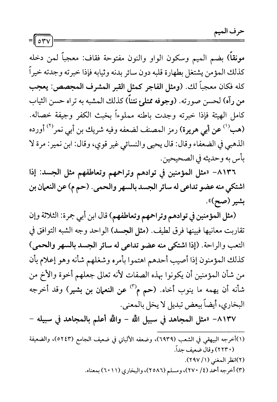 8136 - "مثل المؤمنين في توادهم وتراحمهم وتعاطفهم مثل الجسد: إذا اشتكى منه عضو تداعى له سائر الجسد بالسهر والحمى. (حم م) عن النعمان بن بشير (صح) ".