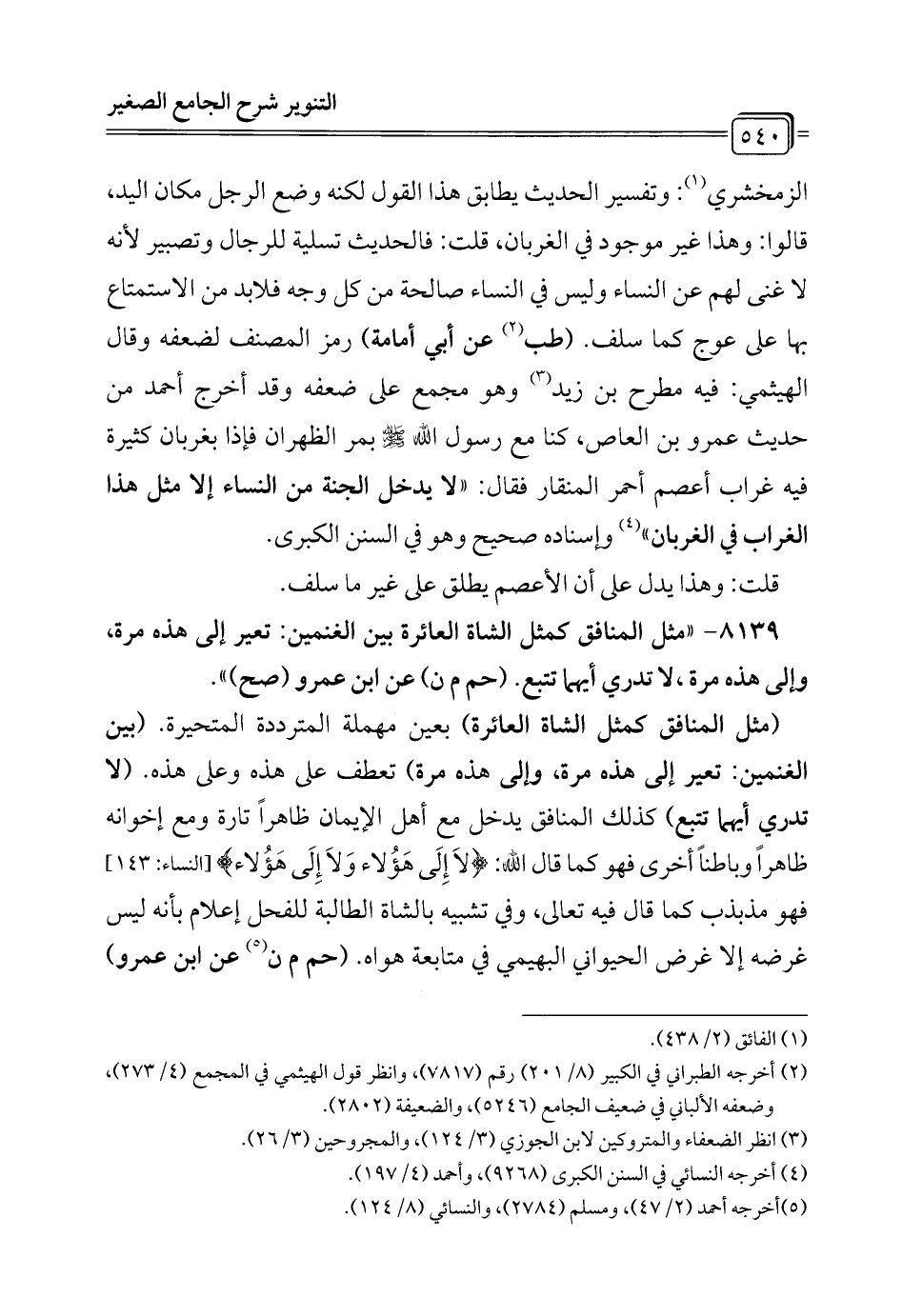 الزمخشري (¬1): وتفسير الحديث يطابق هذا القول لكنه وضع الرجل مكان اليد، قالوا: وهذا غير موجود في الغربان، قلت: فالحديث تسلية للرجال وتصبير لأنه لا غنى لهم عن النساء وليس في النساء صالحة من كل وجه فلابد من الاستمتاع بها على عوج كما سلف. (طب (¬2) عن أبي أمامة) رمز المصنف لضعفه وقال الهيثمي: فيه مطرح بن زيد (¬3) وهو مجمع على ضعفه وقد أخرج أحمد من حديث عمرو بن العاص، كنا مع رسول الله - صلى الله عليه وسلم - بمر الظهران فإذا بغربان كثيرة فيه غراب أعصم أحمر المنقار فقال: "لا يدخل الجنة من النساء إلا مثل هذا الغراب في الغربان" (¬4) وإسناده صحيح وهو في السنن الكبرى.