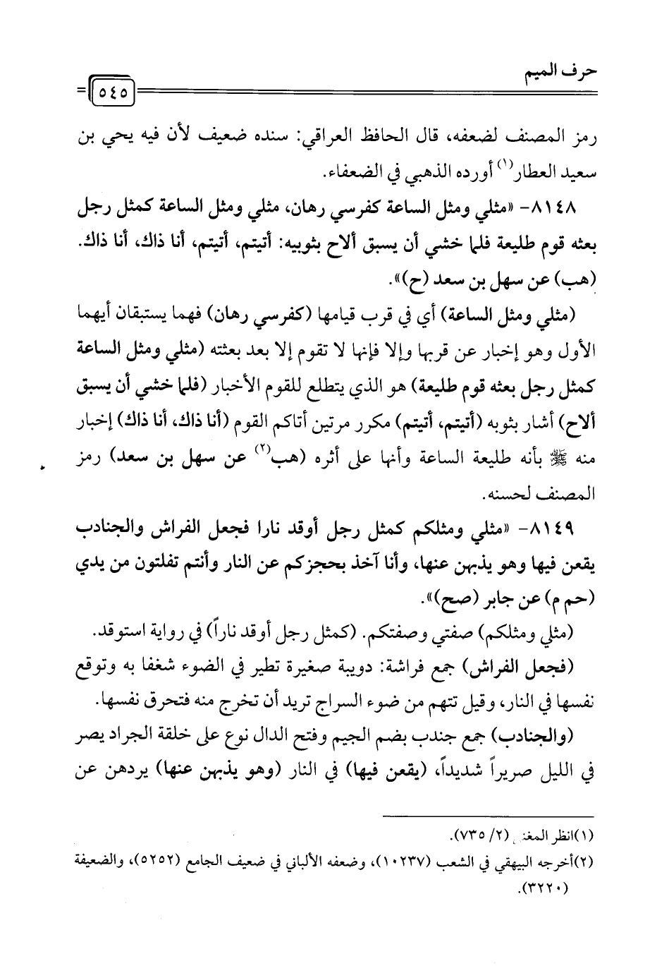 8148 - "مثلي ومثل الساعة كفرسي رهان، مثلي ومثل الساعة كمثل رجل بعثه قوم طليعة فلما خشي أن يسبق ألاح بثوبيه: أتيتم، أتيتم، أنا ذاك، أنا ذاك. (هب) عن سهل بن سعد (ح) ".