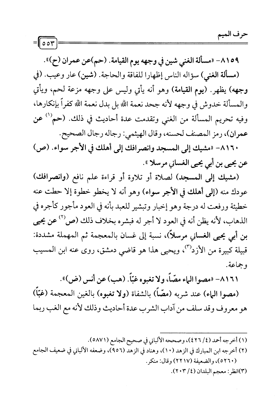 8159 - المسألة الغني شين في وجهه يوم القيامة. (حم) عن عمران (ح) ".