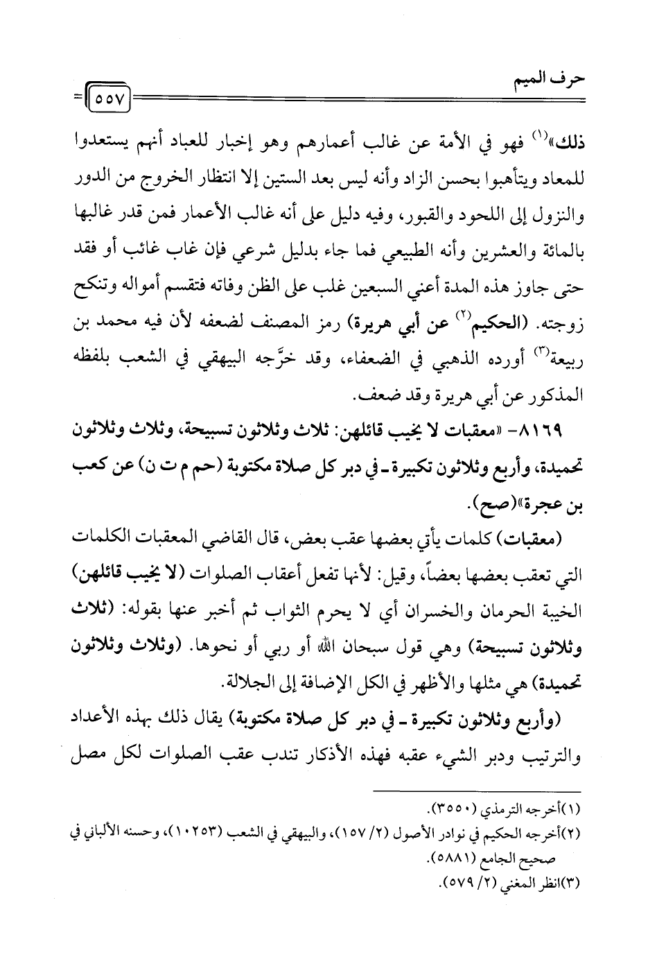8169 - "معقبات لا يخيب قائلهن: ثلاث وثلاثون تسبيحة , وثلاث وثلاثون تحميدة، وأربع وثلاثون تكبيرة -في دبر كل صلاة مكتوبة (حم م ت ن) عن كعب بن عجرة" (صح).
