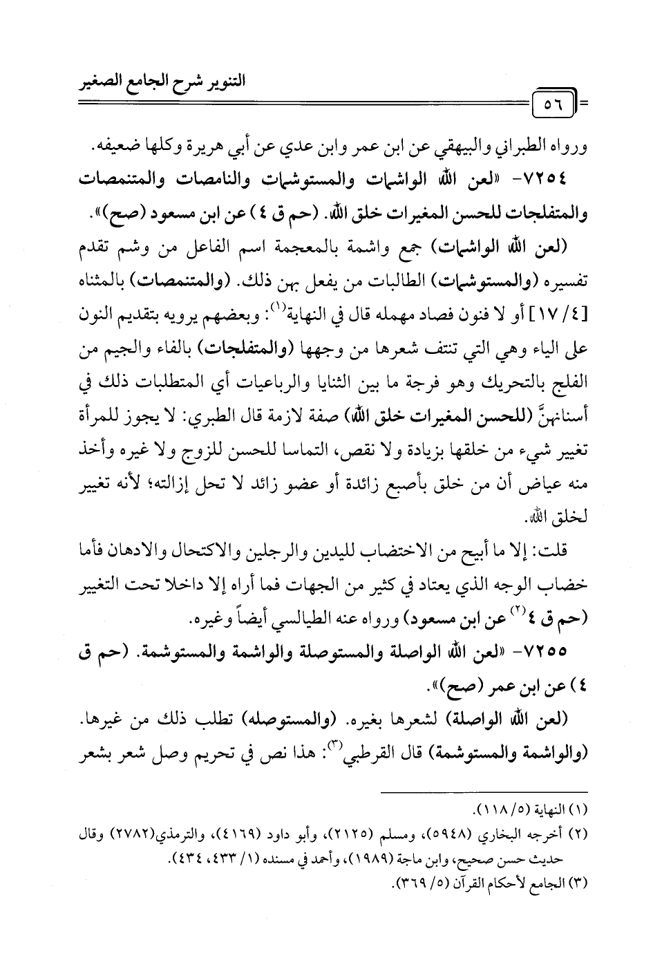 7254 - "لعن الله الواشمات والمستوشمات والنامصات والمتنمصات والمتفلجات للحسن المغيرات خلق الله. (حم ق 4) عن ابن مسعود (صح) ".