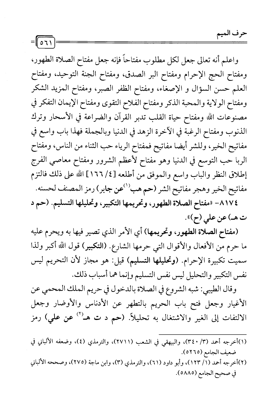 واعلم أنه تعالى جعل لكل مطلوب مفتاحاً فإنه جعل مفتاح الصلاة الطهور، ومفتاح الحج الإحرام ومفتاح البر الصدق، ومفتاح الجنة التوحيد، ومفتاح العلم حسن السؤال والإصغاء، ومفتاح الظفر الصبر، ومفتاح المزيد الشكر ومفتاح الولاية والمحبة الذكر ومفتاح الفلاح التقوى ومفتاح الإيمان التفكر في مصنوعات الله ومفتاح حياة القلب تدبر القرآن والضراعة في الأسحار وترك الذنوب ومفتاح الرغبة في الآخرة الزهد في الدنيا وبالجملة فهذا باب واسع في مفاتيح الخير، وللشر أيضاً مفاتيح فمفتاح الرياء حب الثناء من الناس، ومفتاح الربا حب التوسع في الدنيا وهو مفتاح لأعظم الشرور ومفتاح معاصي الفرج إطلاق النظر والباب واسع والموفق من أطلعه [4/ 166] الله على ذلك فالتزم مفاتيح الخير وهجر مفاتيح الشر (حم هب (¬1) عن جابر) رمز المصنف لحسنه.
