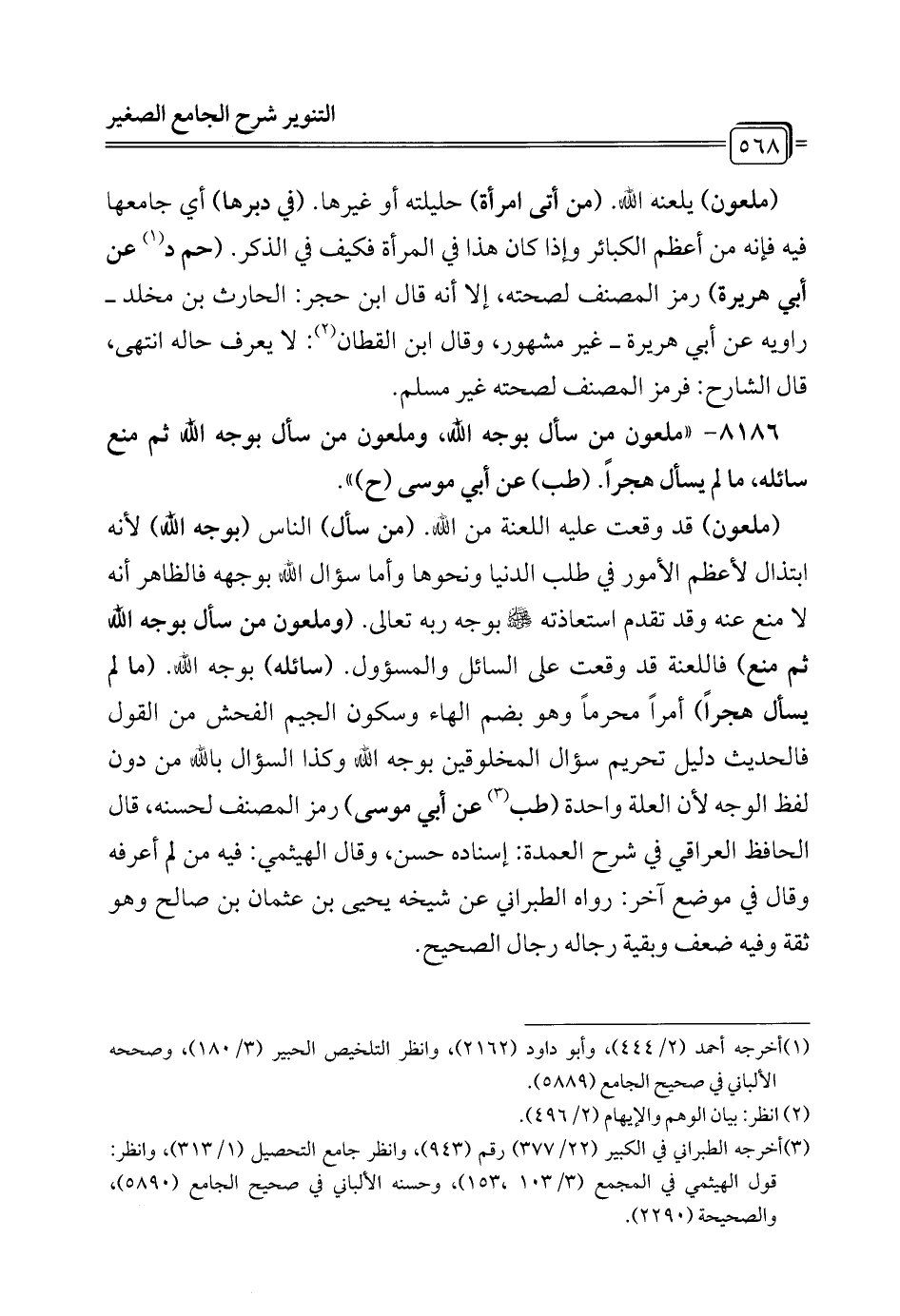 (ملعون) يلعنه الله. (من أتى امرأة) حليلته أو غيرها. (في دبرها) أي جامعها فيه فإنه من أعظم الكبائر وإذا كان هذا في المرأة فكيف في الذكر. (حم د (¬1) عن أبي هريرة) رمز المصنف لصحته، إلا أنه قال ابن حجر: الحارث بن مخلد -راويه عن أبي هريرة- غير مشهور، وقال ابن القطان (¬2): لا يعرف حاله انتهى، قال الشارح: فرمز المصنف لصحته غير مسلم.