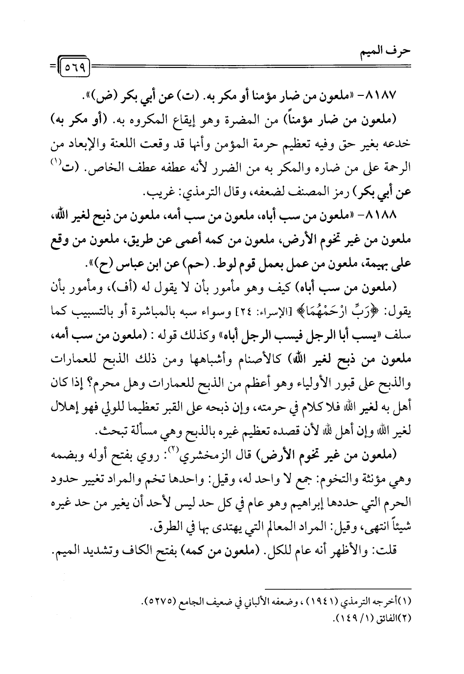 8187 - "ملعون من ضار مؤمنا أو مكر به. (ت) عن أبي بكر (ض) ".