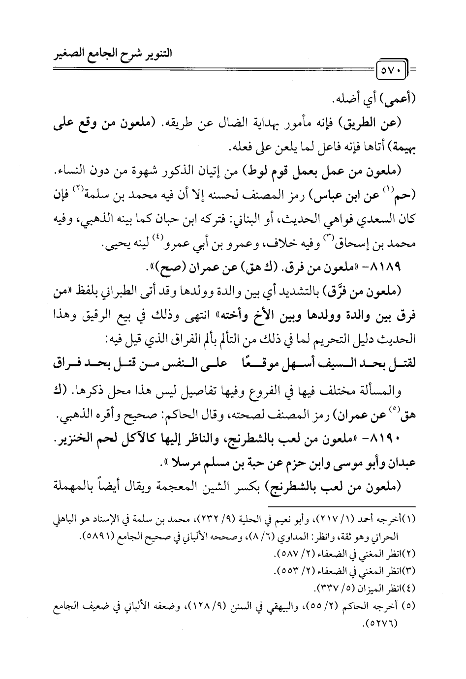 (ملعون من عمل بعمل قوم لوط) من إتيان المذكور شهوة من دون النساء. (حم (¬1) عن ابن عباس) رمز المصنف لحسنه إلا أن فيه محمَّد بن سلمة (¬2) فإن كان السعدي فواهي الحديث، أو البناني: فتركه ابن حبان كما بينه الذهبي، وفيه محمَّد بن إسحاق (¬3) وفيه خلاف، وعمرو بن أبي عمرو (¬4) لينه يحيى.