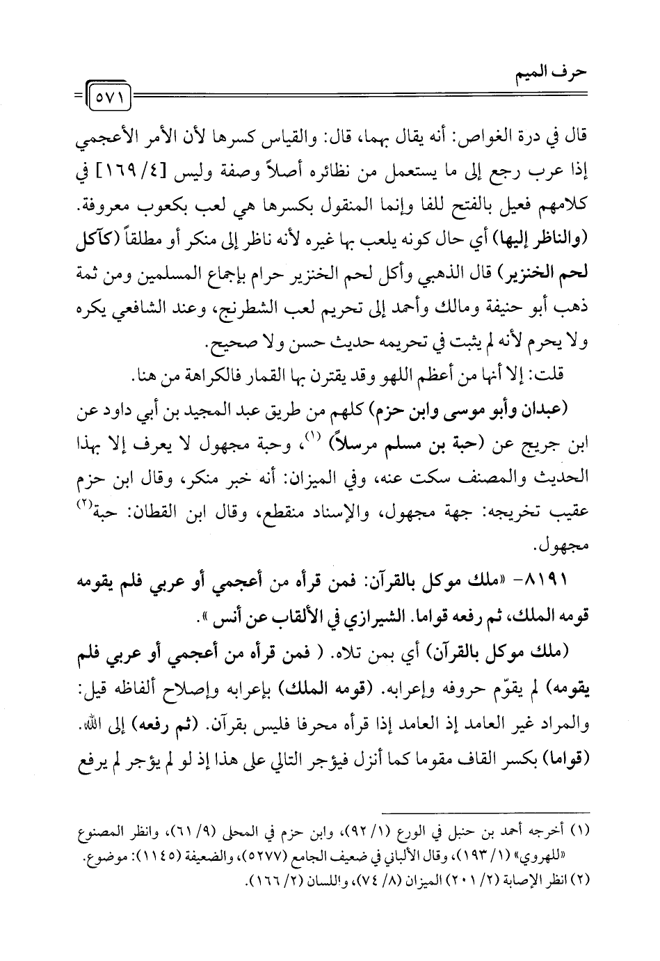 قال في درة الغواص: أنه يقال بهما، قال: والقياس كسرها لأن الأمر الأعجمي إذا عرب رجع إلى ما يستعمل من نظائره أصلاً وصفة وليس [4/ 169] في كلامهم فعيل بالفتح للفا وإنما المنقول بكسرها هي لشعب بكعوب معروفة. (والناظر إليها) أي حال كونه يلعب بها غيره لأنه ناظر إلى منكر أو مطلقاً (كآكل لحم الخنزير) قال الذهبي وأكل لحم الخنزير حرام بإجماع المسلمين ومن ثمة ذهب أبو حنيفة ومالك وأحمد إلى تحريم لشعب الشطرنج، وعند الشافعي يكره ولا يحرم لأنه لم يثبت في تحريمه حديث حسن ولا صحيح.