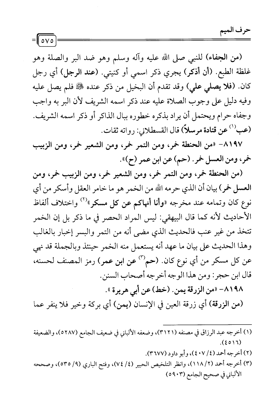 8197 - "من الحنطة خمر، ومن التمر خمر، ومن الشعير خمر، ومن الزبيب خمر، ومن العسل خمر. (حم) عن ابن عمر (ح) ".