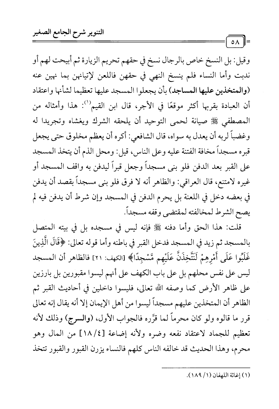 قلت: هذا الحق وأما دفنه - صلى الله عليه وسلم - فإنه ليس في مسجده بل في بيته المتصل بالمسجد ثم زيد في المسجد فدخل القبر في باطنه وأما قوله تعالى: {قَالَ الَّذِينَ غَلَبُوا عَلَى أَمْرِهِمْ لَنَتَّخِذَنَّ عَلَيْهِمْ مَسْجِدًا} [الكهف: 21] فالظاهر أن المسجد ليس على نفس محلهم بل على باب الكهف على أنهم ليسوا مقبورين بل بارزين على ظاهر الأرض كما وصفه الله تعالى، فليسوا داخلين في أحاديث القبر ثم الظاهر أن المتخذين عليهم مسجداً ليسوا من أهل الإيمان إلا أنه يقال إنه تعالى قرر ما قالوه ولو كان محرماً لما قرَّره فالجواب الأول، (والسرج) وذلك لأنه تعظيم للجماد لاعتقاد نفعه وضره ولأنه إضاعة [4/ 18] من المال وهو محرم، وهذا الحديث قد خالفه الناس كلهم فالنساء يزرن القبور والقبور تتخذ