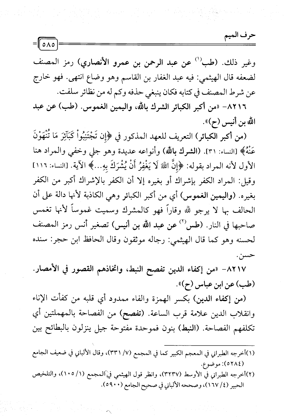 8216 - "من أكبر الكبائر الشرك بالله، واليمين الغموس. (طب) عن عبد الله بن أنيس (ح) ".