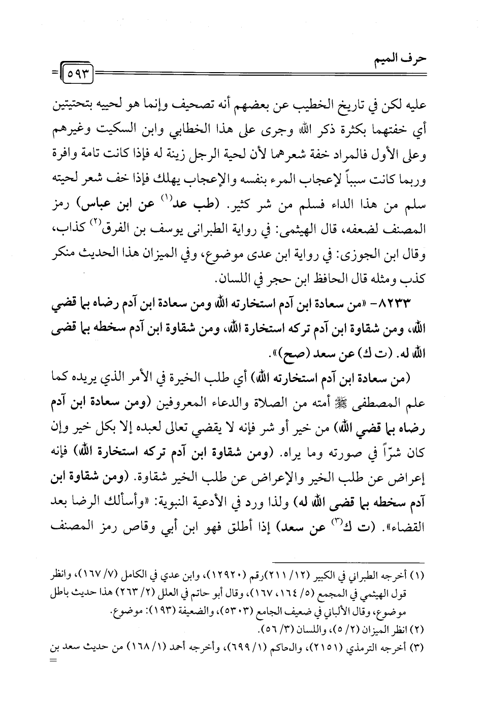 8233 - "من سعادة ابن آدم استخارته الله ومن سعادة ابن آدم رضاه بما قضي الله، ومن شقاوة ابن آدم تركه استخارة الله، ومن شقاوة ابن آدم سخطه بما قضى الله له. (ت ك) عن سعد (صح) ".