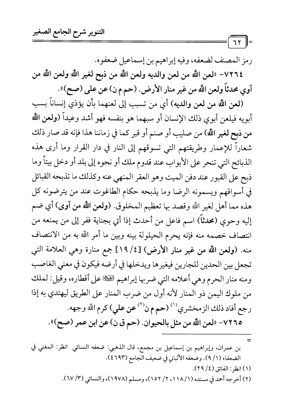 7264 - "لعن الله من لعن والديه ولعن الله من ذبح لغير الله ولعن الله من آوي محدثاً ولعن الله من غير منار الأرض. (حم م ن) عن علي (صح) ".