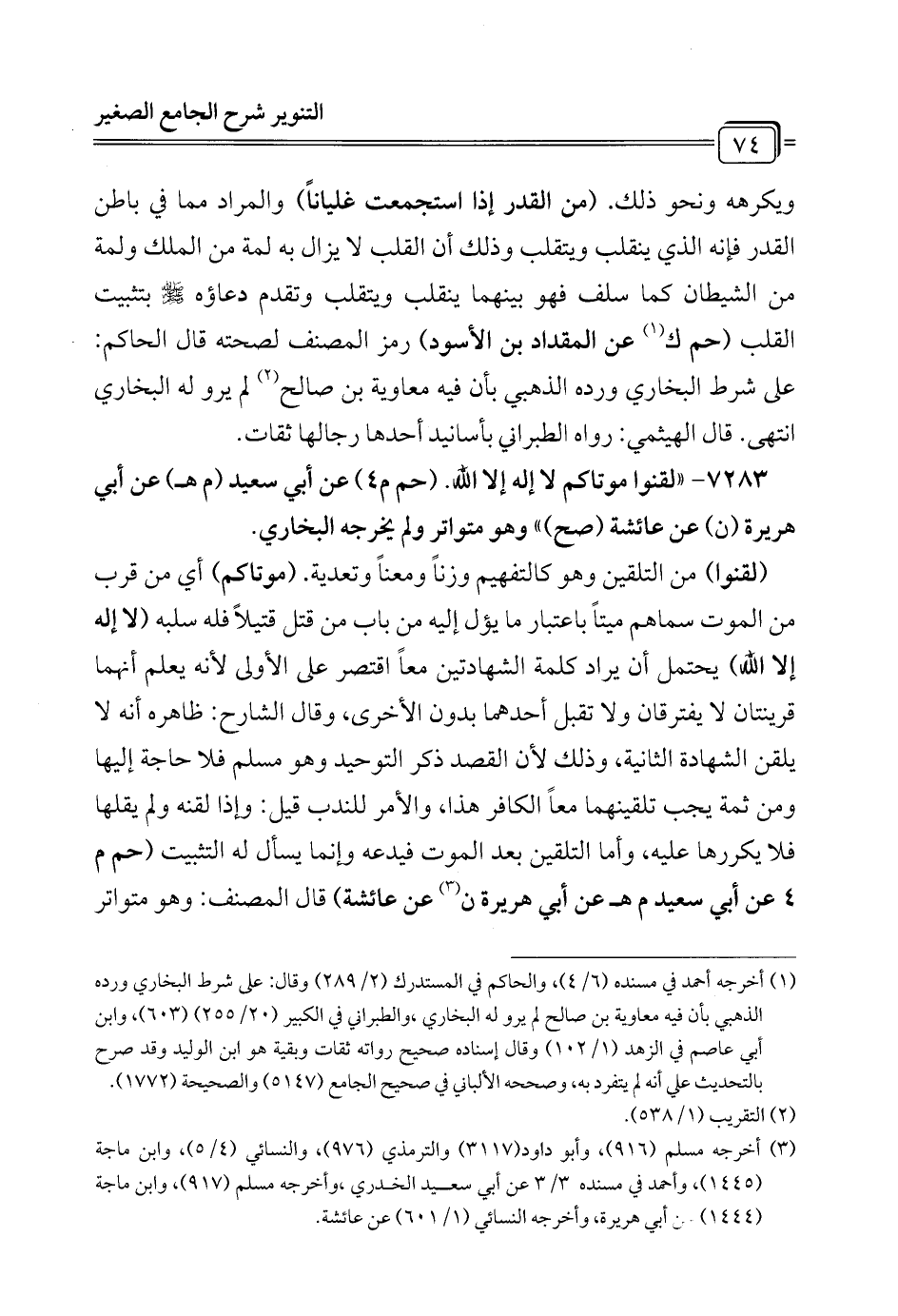 7283 - "لقنوا موتاكم لا إله إلا الله. (حم م 4) عن أبي سعيد (م هـ) عن أبي هريرة (ن) عن عائشة (صح) " وهو متواتر ولم يخرجه البخاري.