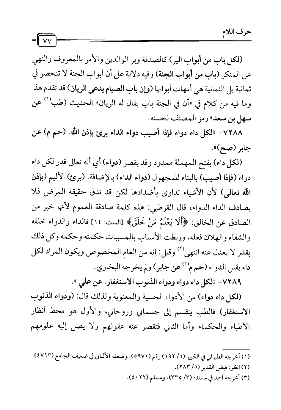 7288 - "لكل داء دواء فإذا أصيب دواء الداء برئ بإذن الله. (حم م) عن جابر (صح) ".