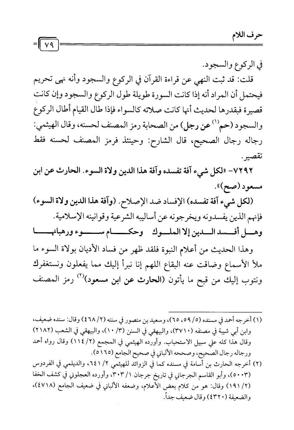 وهذا الحديث من أعلام النبوة فلقد ظهر من فساد الأديان بولاة السوء ما ملأ الأسماع وضاقت عنه البقاع اللهم إنا نبرأ إليك مما يفعلون ونستغفرك ونتوب إليك من قبح ما يأتون (الحارث عن ابن مسعود) (¬2) رمز المصنف