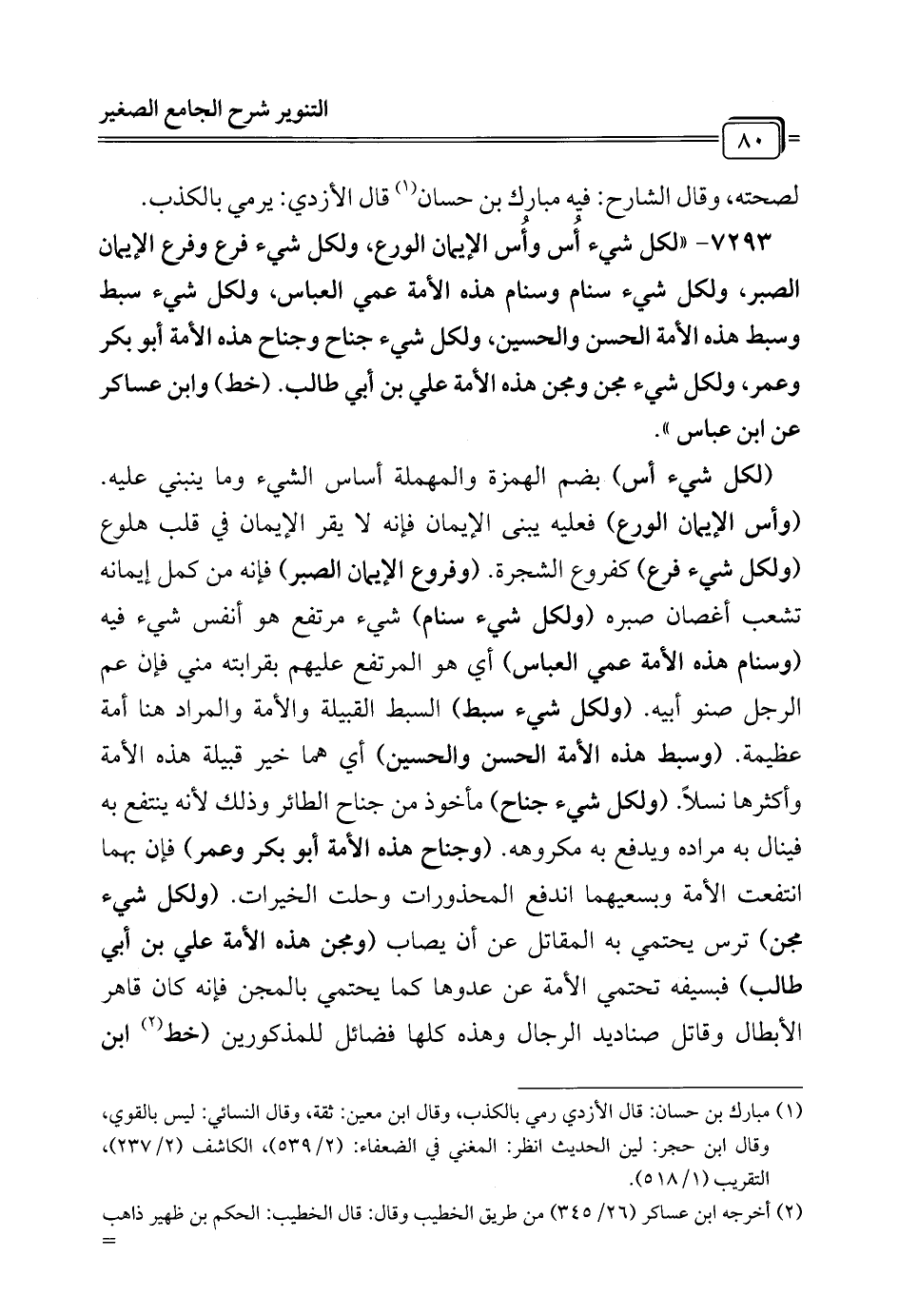 (لكل شيء أس) بضم الهمزة والمهملة أساس الشيء وما ينبني عليه. (وأس الإيمان الورع) فعليه يبنى الإيمان فإنه لا يقر الإيمان في قلب هلوع (ولكل شيء فرع) كفروع الشجرة. (وفروع الإيمان الصبر) فإنه من كمل إيمانه تشعب أغصان صبره (ولكل شيء سنام) شيء مرتفع هو أنفس شيء فيه (وسنام هذه الأمة عمي العباس) أي هو المرتفع عليهم بقرابته مني فإن عم الرجل صنو أبيه. (ولكل شيء سبط) السبط القبيلة والأمة والمراد هنا أمة عظيمة. (وسبط هذه الأمة الحسن والحسين) أي هما خير قبيلة هذه الأمة وأكثرها نسلاً. (ولكل شيء جناح) مأخوذ من جناح الطائر وذلك لأنه ينتفع به فينال به مراده ويدفع به مكروهه. (وجناح هذه الأمة أبو بكر وعمر) فإن بهما انتفعت الأمة وبسعيهما اندفع المحذورات وحلت الخيرات. (ولكل شيء مجن) ترس يحتمي به المقاتل عن أن يصاب (ومجن هذه الأمة علي بن أبي طالب) فبسيفه تحتمي الأمة عن عدوها كما يحتمي بالمجن فإنه كان قاهر الأبطال وقاتل صناديد الرجال وهذه كلها فضائل للمذكورين (خط (¬2) ابن