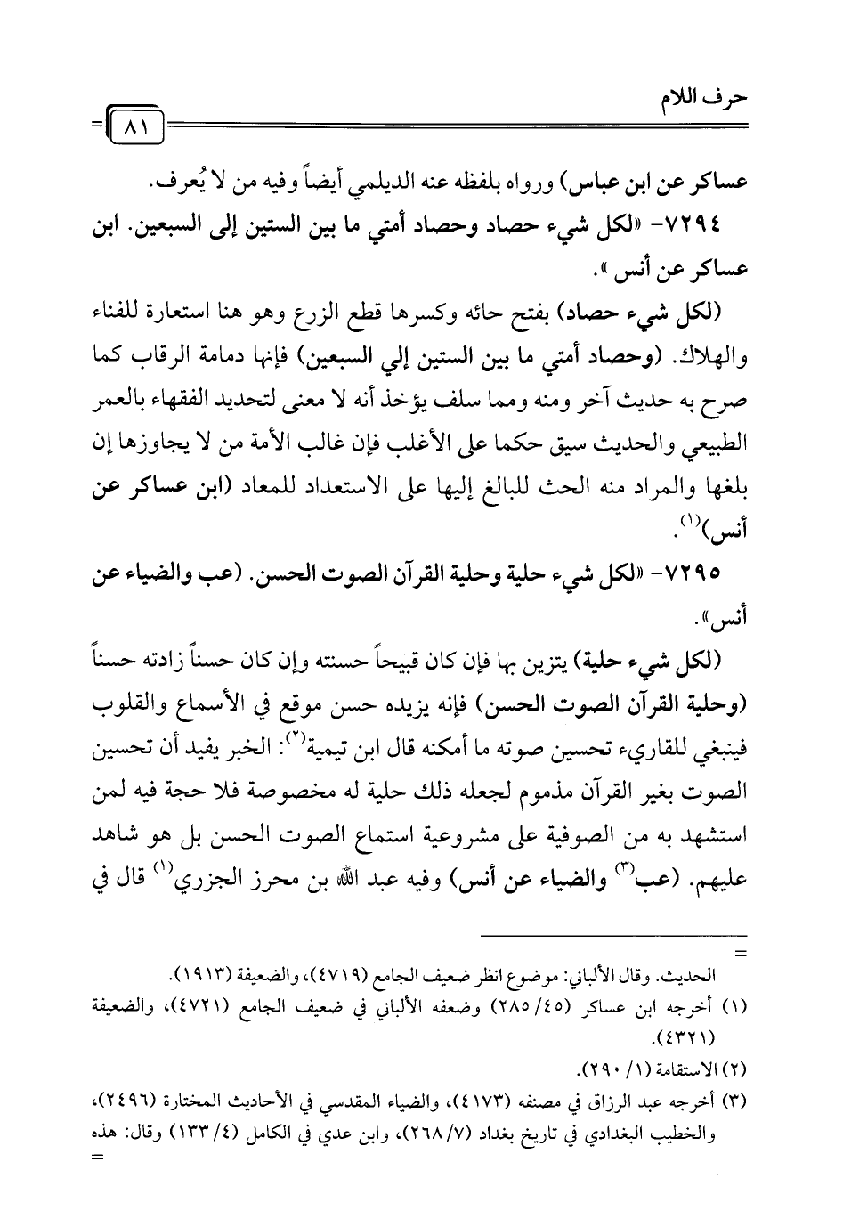 7295 - "لكل شيء حلية وحلية القرآن الصوت الحسن. (عب والضياء عن أنس".
