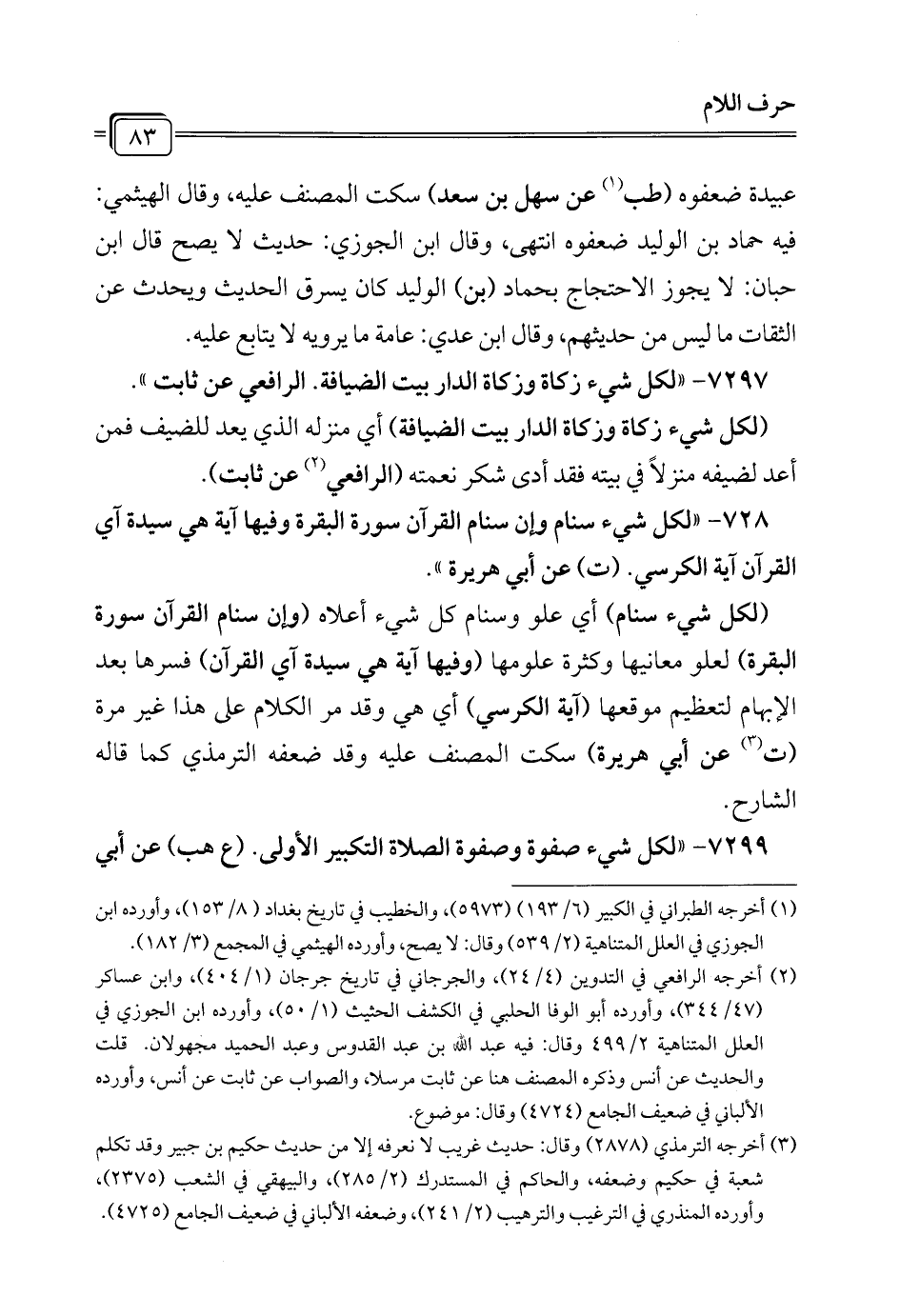 7297 - "لكل شيء زكاة وزكاة الدار بيت الضيافة. الرافعي عن ثابت".