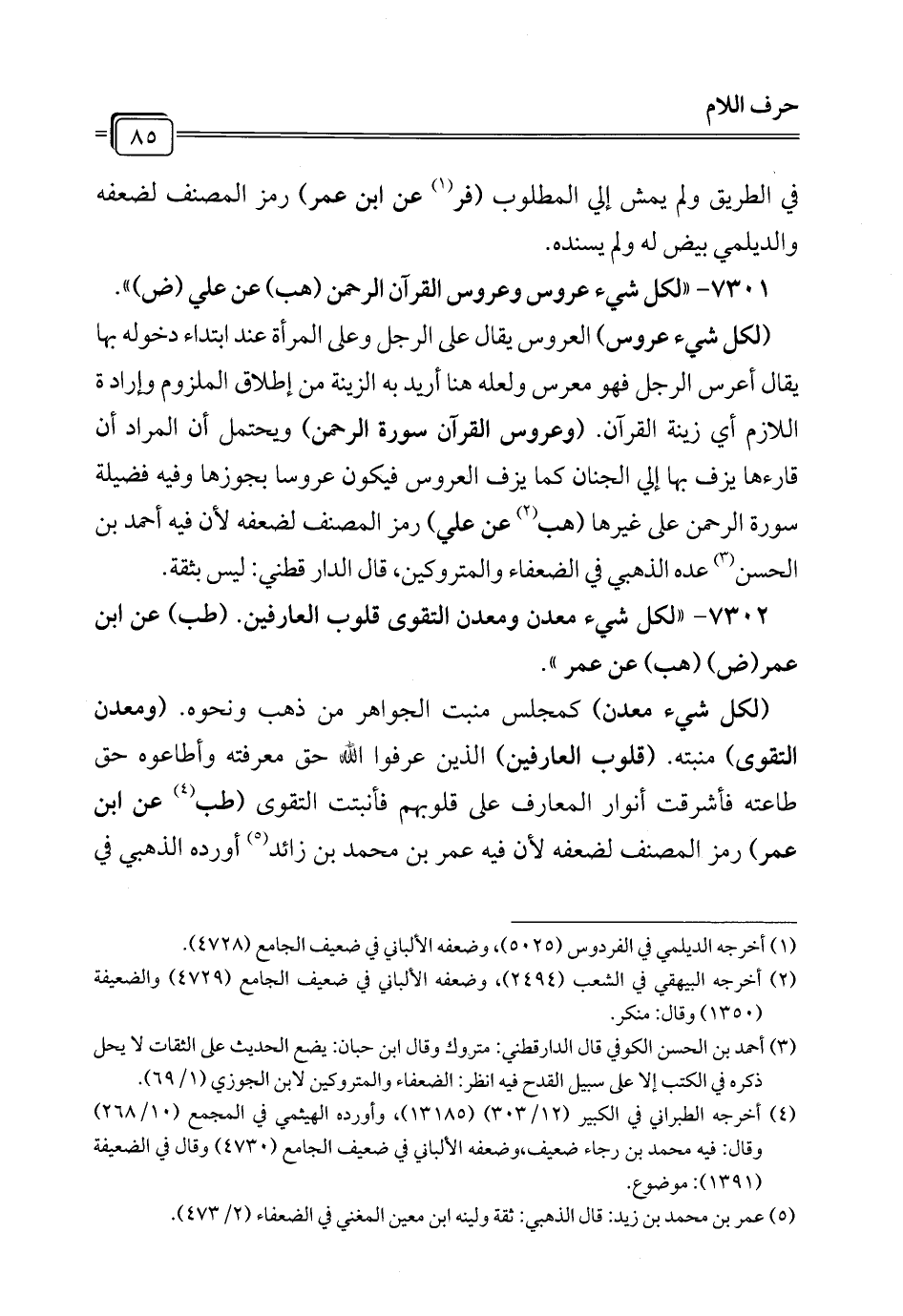 7301 - "لكل شيء عروس وعروس القرآن الرحمن (هب) عن علي (ض) ".