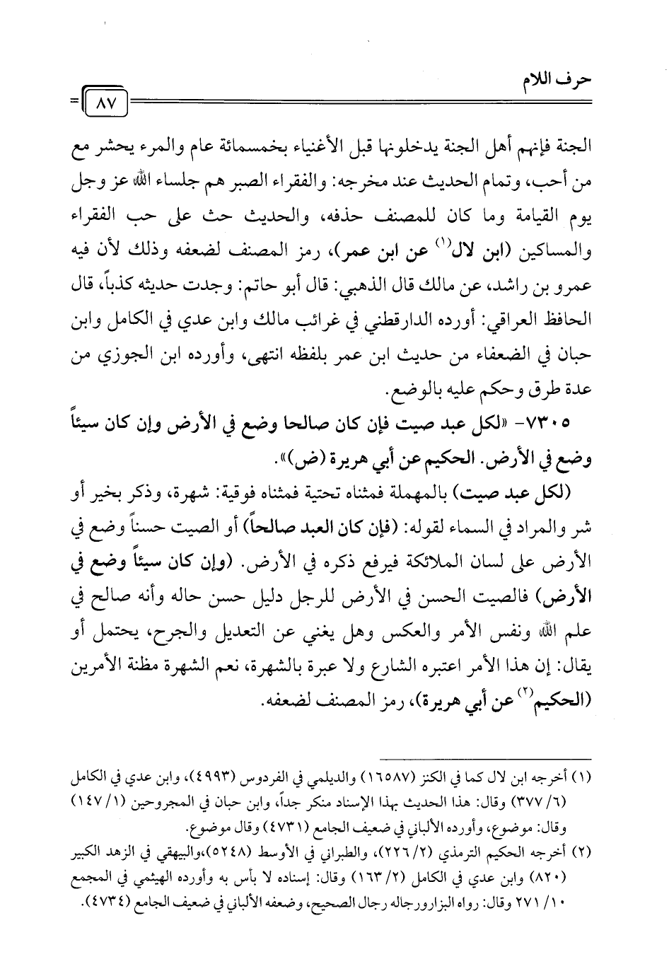7305 - "لكل عبد صيت فإن كان صالحا وضع في الأرض وإن كان سيئاً وضع في الأرض. الحكيم عن أبي هريرة (ض) ".