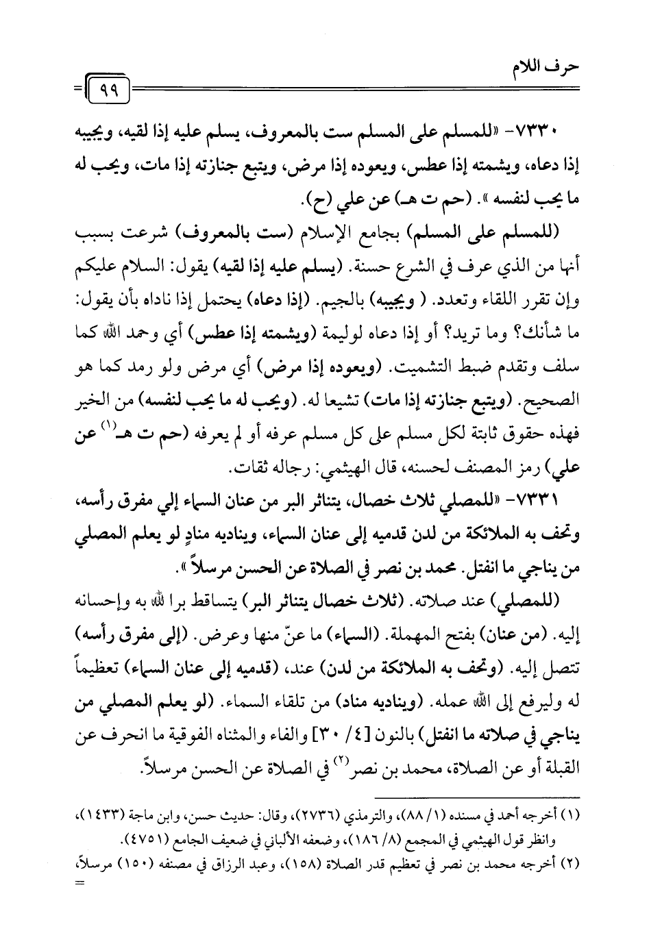 7331 - "للمصلي ثلاث خصال، يتناثر البر من عنان السماء إلى مفرق رأسه, وتحف به الملائكة من لدن قدميه إلى عنان السماء، ويناديه منادٍ لو يعلم المصلي من يناجي ما انفتل. محمَّد بن نصر في الصلاة عن الحسن مرسلاً".