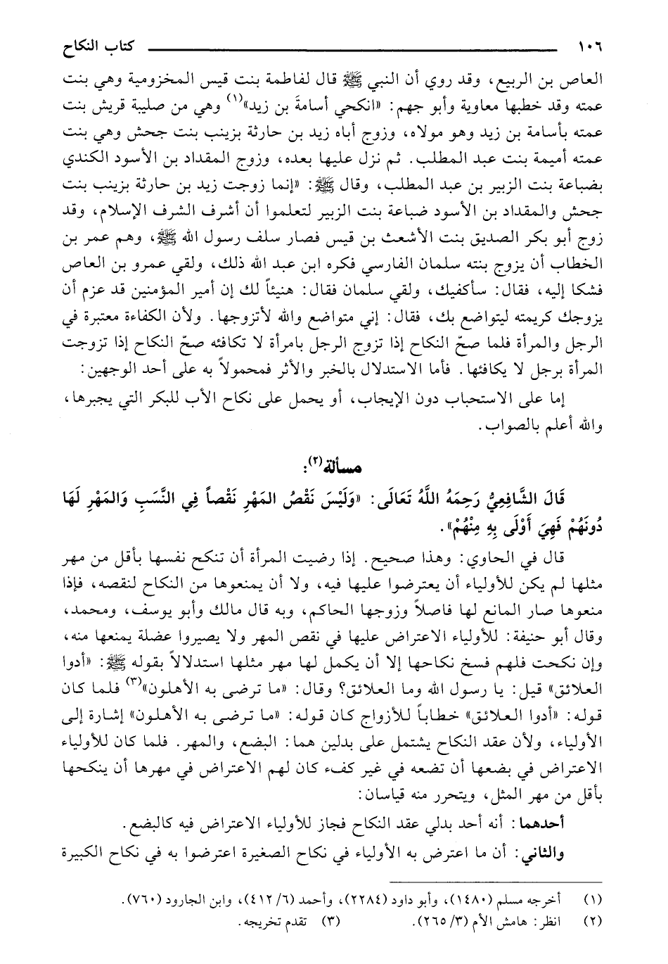 العاص بن الربيع، وقد روي أن النبي صلي الله عليه وسلم قال لفاطمة بنت قيس المخزومية وهي بنت عمته وقد خطبها معاوية وأبو جهم: "انكحي أسامه بن زيد" وهي من صليبة قريش بنت عمته بأسامة بن زيد وهو مولاه، وزوج أباه زيد بن حارثه بزينب بنت جحش وهي بنت عمته أميمه بنت عبد المطلب. ثم نزل عليها بعده، وزوج المقداد بن الأسود الكندي بضباعة بنت الزبير بن عبد المطلب، وقال صلي الله عليه وسلم:" إنما زوجت زيد بن حارثه بزينب بنت جحش والمقداد بن الأسود ضباعة بنت الزبير لتعلموا ان اشرف الشرف الإسلام، وقد زوج أبو بكر الصديق بنت الأشعث بن قيس فصار سلف رسول الله صلي الله عليه وسلم، وهم عمر بن الخطاب أن يزوج بنته سلمان الفارسي فكره ابن عبد الله ذلك، ولقي عمرو بن العاص فشكا إليه، فقال: سأكفيك، ولقي سلمان فقال: هنيئاً لك إن أمير المؤمنين قد عزم أن يزوجك كريمته ليتواضع بك، فقال: أني متواضع والله لا تزوجها. ولأن الكفاءة معتبرة في الرجل والمرأة فلما صح النكاح إذا تزوج الرجل بامرأة لا تكافئه صح النكاح إذا تزوجت المرأة برجل لا يكافئها. فأما الاستدلال بالخبر والأثر فمحمولاً به علي أحد الوجهين: