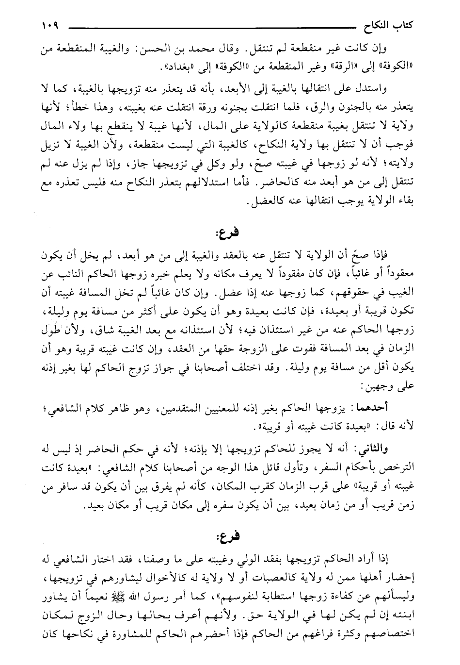والثاني: أنه لا يجوز للحاكم تزويجها إلا بإذنه؛ لأنه في حكم الحاضر إذ ليس له الترخص بأحكام السفر، وتأول قائل هذا الوجه من أصحابنا كلام الشافعي:" بعيدة كانت غيبته أو قريبة" علي قرب الزمان كقرب المكان، كأنه لم يفرق بين أن يكون قد سافر من زمن قريب أو من زمان بعيد، بين أن يكون سفره إلي مكان قريب أو مكان بعيد.