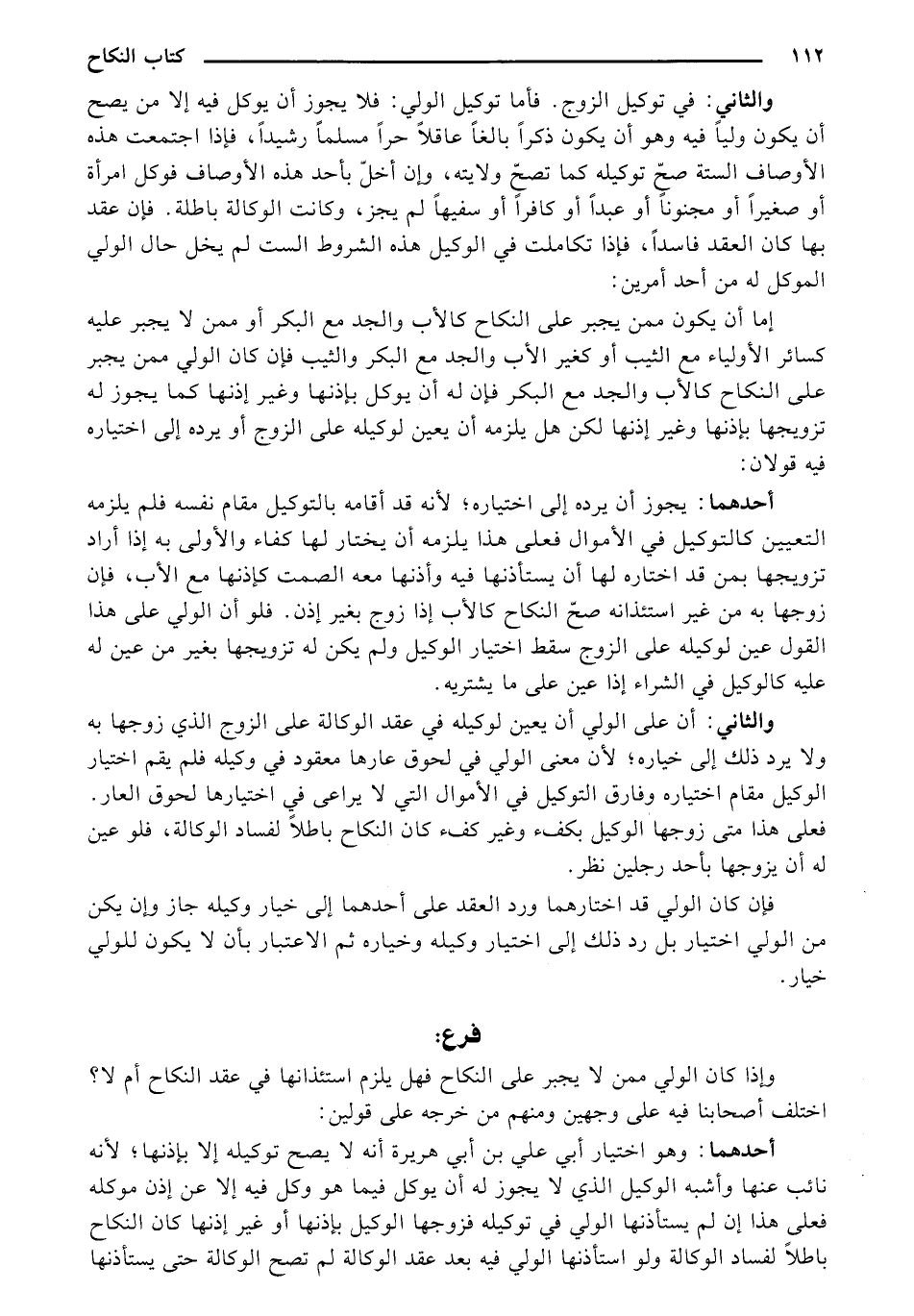 والثاني: في توكيل الزوج. فأما توكيل الولي: فلا يجوز: أن يوكل فيه إلا من يصح أن يكون وليا فيه وهو أن يكون ذكراً بالغاً عاقلاً حراً مسلماً رشيداً، فإذا اجتمعت هذه الأوصاف الستة صح توكليه كما تصح ولا يته، وإن أخل بأحد هذه الأوصاف فوكل امرأة أو صغيراً أو مجنوناً أو عبداً أو كافراً أو سفيهاً لم يجز، وكانت الوكالة باطلة. فإن عقد بها كان العقد فاسداً، فإذا تكاملت في الوكيل هذه الشروط ليست لم يخل حال الولي الموكل له من أحد أمرين: