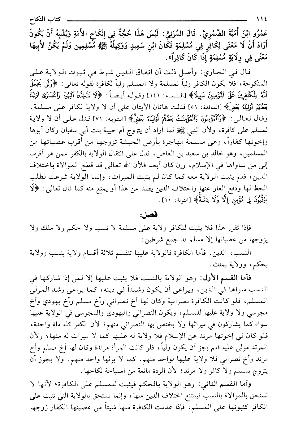 النسب، الدين. فأما الكافرة فالولاية عليها تنقسم ثلاثة أقسام ولاية بحكم، وولاية بملك.