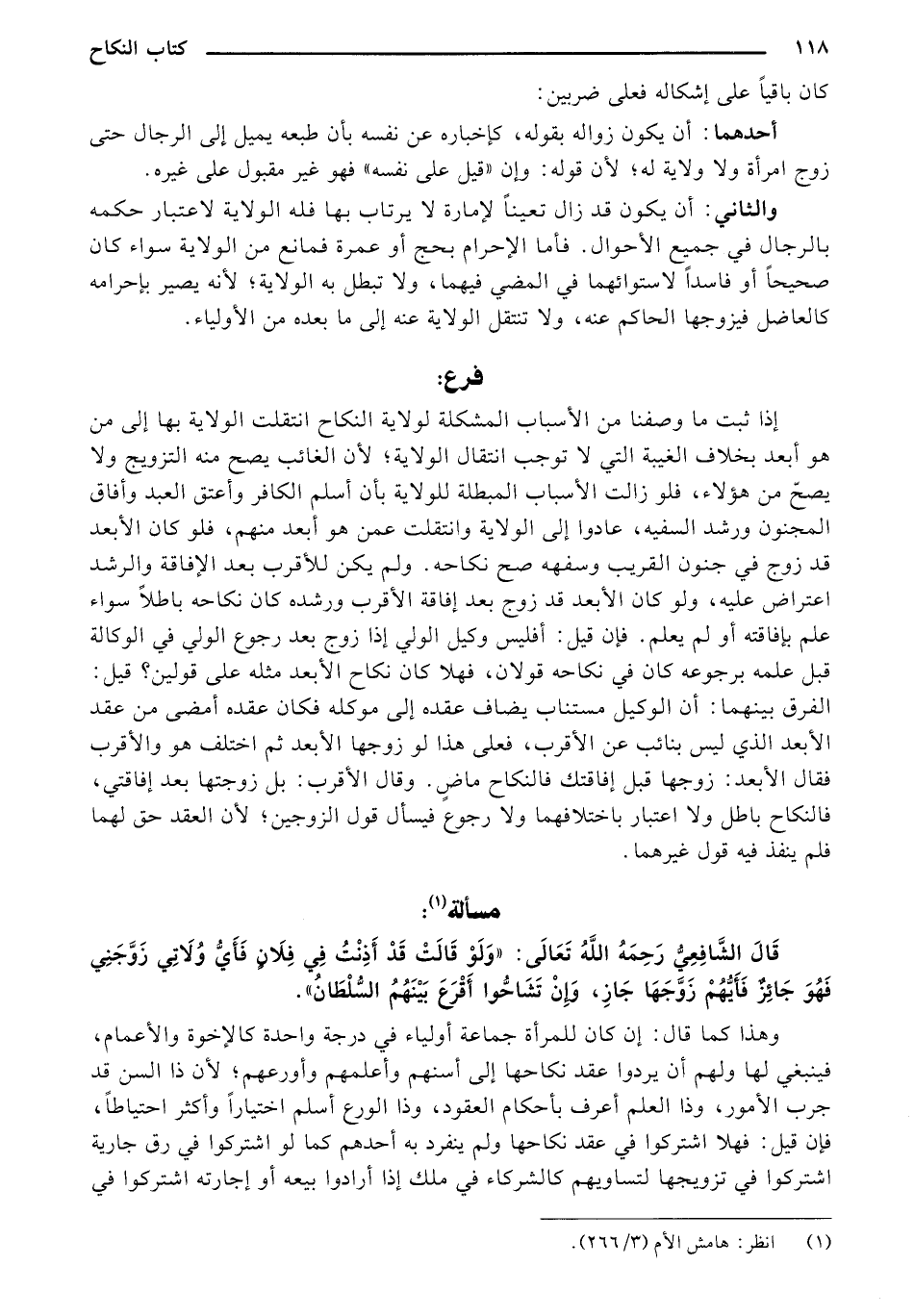 إذ ثبت ما وصفنا من الأسباب المشكلة لولاية النكاح انتقلت الولاية بها إلي من هو ابعد بخلاف الغيبة التي لا توجب انتقال الولاية؛ لأن الغائب يصح منه التزويج ولا يصح من هؤلاء، فلو زالت الأسباب المبطلة للولاية بأن اسلم الكافر واعتق البعد وأفاق المجنون ورشد السفيه، عادوا إلي الولاية وانتقلت عمن هو ابعد منهم، فلو كان الأبعد قد زوج في جنون القريب وسفهه صح نكاحه. ولم يكن للأقرب بعد الإفاقة والرشد اعتراض عليه، ولو كان الأبعد قد زوج بعد إفاقة الأقرب ورشده كان نكاحه باطلا سواء علم بإفاقته أو لم يعلم. فإن قيل: وكيل الولي إذا زوج بعد رجوع الولي في الوكالة قبل علمه برجوعه كان في نكاحه قولان، فهلا كان نكاح إلا بعد مثله علي قولين؟ قيل: الفرق بينهما: أن الوكيل مستناب يضاف عقده إلي موكله فكان عقده امضي من عقد الأبعد الذي ليس بنائب عن الأقرب، فعلي هذا لو زوجها إلا بعد ثم اختلف هو والأقرب فقال الأبعد: زوجها قبل إفاقتك فالنكاح ماضٍ. وقال الأقرب: بل زوجتها بعد إفاقتي، فالنكاح باطل ولا اعتبار باختلافهما ولا رجوع فيسأل قول الزوجين؛ لأن العقد حق لهما فلم ينفذ فيه قول غيرهما.