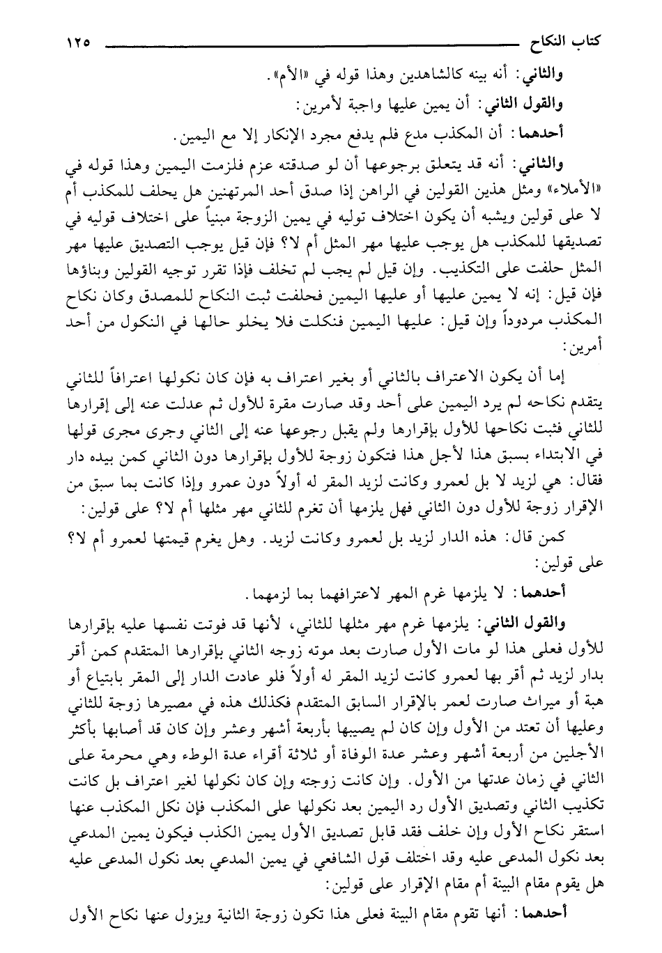 والقول الثاني: يلزمها غرم مهر مثلها للثاني، لأنها قد فوتت نفسها عليه بإقرارها للأول فعلى هذا لو مات الأول صارت بعد موته زوجه الثاني بإقرارها المتقدم كمن أقر بدار لزيد ثم أقر بها لعمرو كانت لزيد المقر له أولًا فلو عادت الدار إلى المقر بابتياع أو هبة أو ميراث صارت لعمر بالإقرار السابق المتقدم فكذلك هذه في مصيرها زوجة للثاني وعليها أن تعتد من الأول وإن كان لم يصيبها بأربعة أشهر وعشر وإن كان قد أصابها بأكثر الأجلين من أربعة أشهر وعشر عدة الوفاة أو ثلاثة أقراء عدة الوطء وهي محرمة على الثاني في زمان عدتها من الأول. وإن كانت زوجته وإن كان نكولها لغير اعتراف بل كانت تكذيب الثاني وتصديق الأول رد اليمين بعد نكولها على المكذب فإن نكل المكذب عنها استقر نكاح الأول وإن خلف فقد قابل تصديق الأول يمين الكذب فيكون يمين المدعي بعد نكول المدعى عليه وقد اختلف قول الشافعي في يمين المدعي بعد نكول المدعي عليه هل يقوم مقام البينة أم مقام الإقرار على قولين: