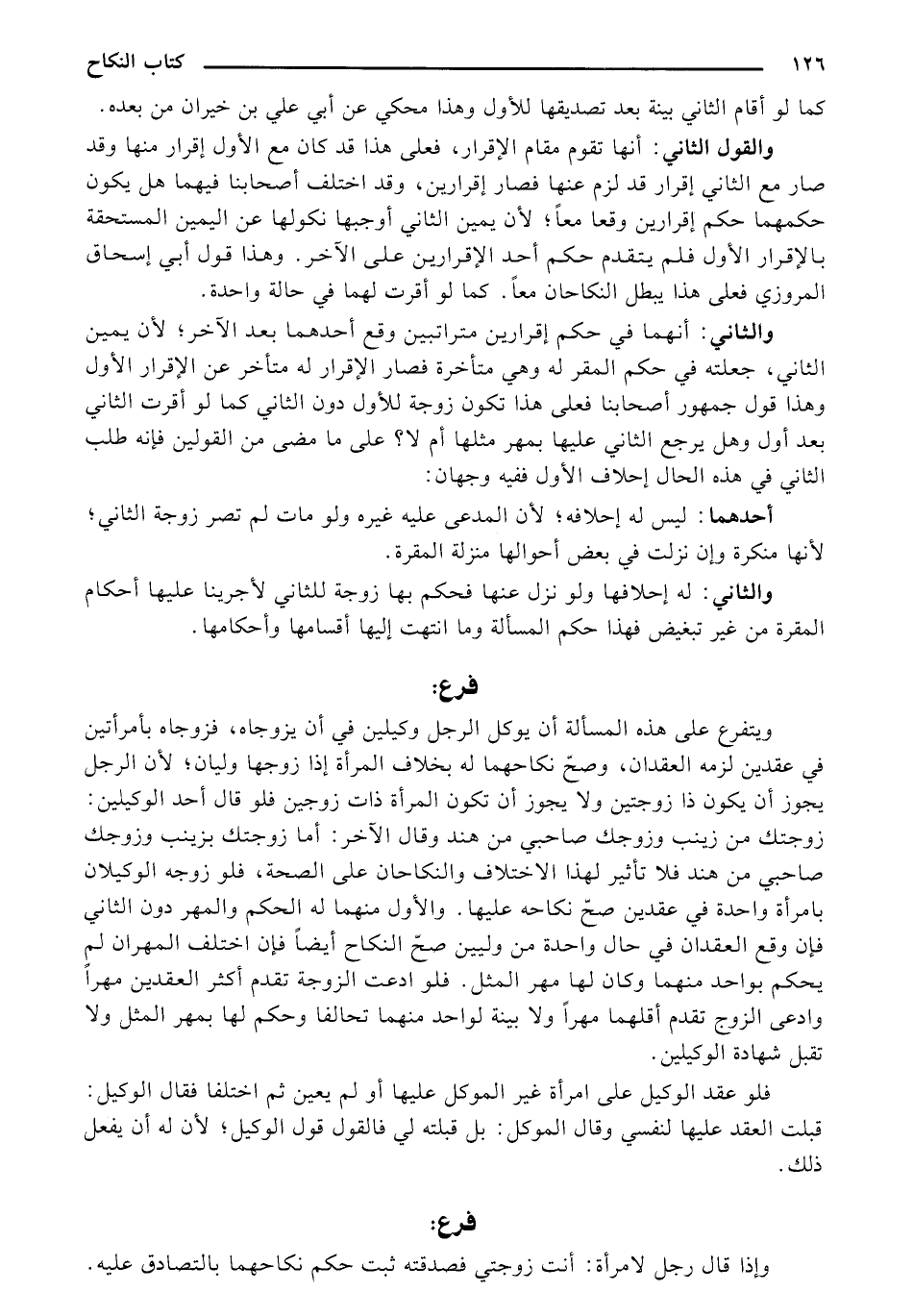 ويتفرع على هذه المسألة أن يوكل الرجل وكيلين في أن يزوجاه، فزوجاه بامرأتين في عقدين لزمه العقدان، وصح نكاحهما له بخلاف المرأة إذا زوجها وليان؛ لأن الرجل يجوز أن يكون ذا زوجتين ولا يجوز أن تكون المرأة ذات زوجين فلو قال أحد الوكيلين: زوجتك من زينب وزوجك صاحبي من هند وقال الآخر: أما زوجتك بزينب وزوجك صاحبي من هند فلا تأثير لهذا الاختلاف والنكاحان على الصحة، فلو زوجه الوكيلان بامرأة واحدة في عقدين صحّ نكاحه عليها. والأول منهما له الحكم والمهر دون الثاني فإن وقع العقدان في حال واحدة من وليين صحّ النكاح أيضًا فإن اختلف المهران لم يحكم بواحد منهما وكان لها مهر المثل. فلو ادعت الزوجة تقدم أكثر العقدين مهرًا وادعى الزوج تقدم أقلهما مهرًا ولا بينه لواحد منهما تحالفا وحكم لها بمهر المثل ولا تقبل شهادة الوكيلين.