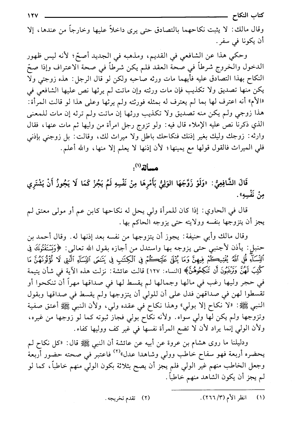 وقال مالك وأبي حنيفة: يجوز أن يتزوجها من نفسه بعد إذنها ل. وقال أحمد بن حنبل: يأذن لأجنبي حتى يزوجه بها واستدل من أجازه بقول الله تعالى: {ويَسْتَفْتُونَكَ فِي النِّسَاءِ قُلِ اللَّهُ يُفْتِيكُمْ فِيهِنَّ ومَا يُتْلَى عَلَيْكُمْ فِي الكِتَابِ فِي يَتَامَى النِّسَاءِ اللاَّتِي لا تُؤْتُونَهُنَّ مَا كُتِبَ لَهُنَّ وتَرْغَبُونَ أَن تَنكِحُوهُنَّ} [النساء: 127] قالت عائشة: نزلت هذه الآية في شأن يتيمة في حجر وليها رغب في مالها وجمالها لم يقسط لها في صداقها مهرًا أن تنكحوا أو تقسطوا لهن في صداقهن فدل على أن للولي أن يتزوجها ولم يقسط في صداقها وبقول النبي صلى الله عليه وسلم: "لا نكاح إلا بولي "وهذا نكاح في عقده ولي، ولأن النبي صلى الله عليه وسلم أعتق صفية وتزوجها ولم يكن لها ولي سواه. ولأنه نكاح بولي فجاز ثبوته كما لو زوجها من غيره، ولأن الولي إنما يراد لأن لا تضع المرأة نفسها في غير كف ووليها كفاء.