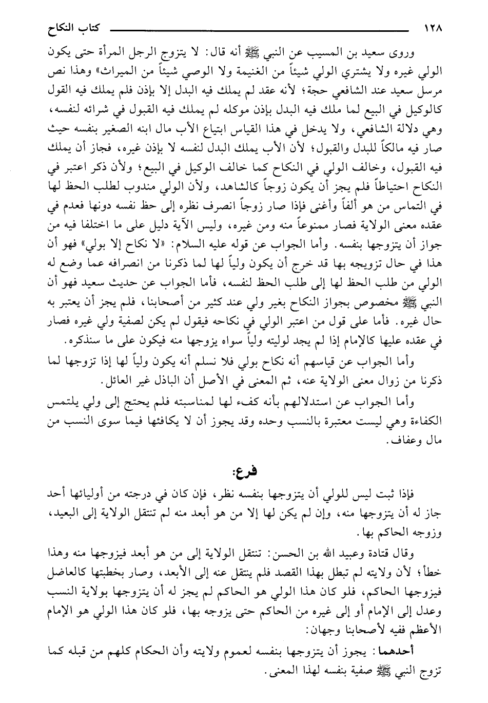 (وروى) سعيد بن المسيب عن النبي صلى الله عليه وسلم أنه قال: لا يتزوج الرجل المرأة حتى يكون الولي غيره ولا يشتري الولي شيئًا من الغنيمة ولا الوصي شيئًا من الميراث "وهذا نص مرسل سعيد عند الشافعي حجة؛ لأنه عقد لم يملك فيه البدل إلا بإذن فلم يملك في القول كالوكيل في البيع لما ملك فيه البدل بإذن موكله لم يملك فيه القبول في شرائه لنفسه، وهي دلالة الشافعي، ولا يدخل في هذا القياس ابتياع الأب مال ابنه الصغير بنفس حيث صار فيه مالكًا للبدل والقبول؛ لأن الأب يملك البدل لنفسه لا بإذن غيره، فجاز أن يملك فيه القبول، وخالف الولي في النكاح كما خالف الوكيل في البيع؛ ولأن ذكر اعتبر في النكاح احتياطًا فلم يجز أن يكون زوجًا كالشاهد، ولأن الولي مندوب لطلب الحظ لها في التماس من هو ألفًا وأغنى فإذا صار زوجًا انصرف نظره إلى حظ نفسه دونها فعدم في عقده معنى الولاية فصار ممنوعًا منه ومن غيره، وليس الآن دليل على ما اختلفنا في من جواز أن يتزوجها بنفسه. وأما الجواب عن قوله عليه السلام: "لا نكاح إلا بولي "فهو أن هذا في حال تزويجه بها قد خرج أن يكون وليًا لها لما ذكرنا من انصرافه عما وضع له الولي من طلب الحظ لها إلى طلب الحظ لنفسه، فأما الجواب عن حديث سعيد فهو أن النبي صلى الله عليه وسلم مخصوص بجواز النكاح بغير ولي عند كثير من أصحابنا، فلم يجز أن يعتبر به حال غيره. فأما على قول من اعتبر الولي في نكاحه فيقول لم يكن لصفية ولي غيره فصار في عقده عليها كالإمام إذا لم يجد لوليته وليًا سواه يزوجها منه فيكون على ما سنذكره.