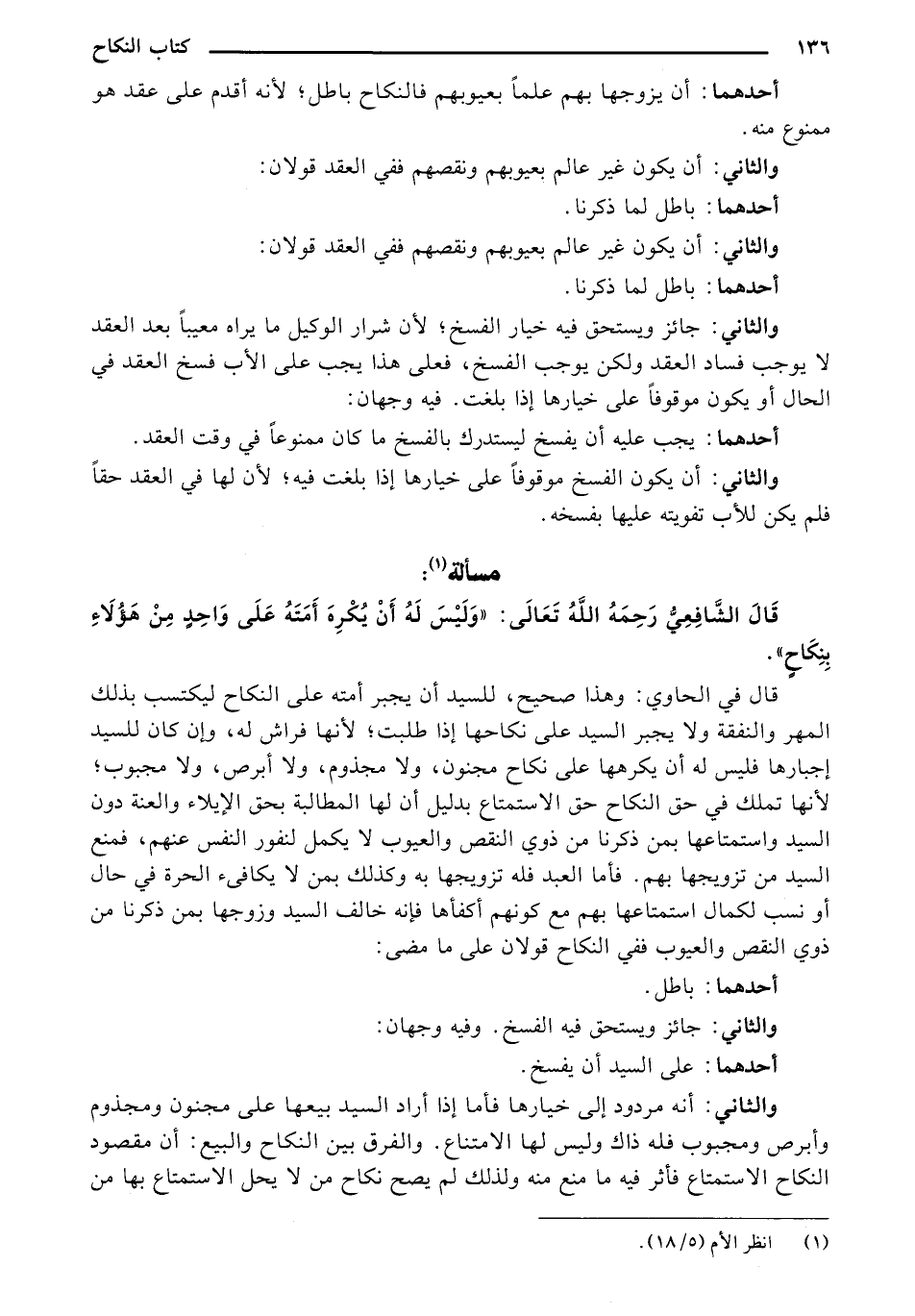 قال في الحاوي: وهذا صحيح، للسيد أن يجبر أمته على النكاح ليكتسب بذلك المهر والنفقة ولا يجبر السيد على نكاحها إذا طلبت؛ لأنها فراش له، وإن كان للسيد إجبارها فليس له أن يكرهها على نكاح مجنون، ولا مجذوم، ولا أبرص، ولا مجبوب؛ لأنها تملك في حق النكاح حق الاستمتاع بدليل أن لها المطالبة بحق الإيلاء والعنة دون السيد واستمتاعها بمن ذكرنا من ذوي النقص والعيوب لا يكمل لنفور النفس عنهم، فمنع السيد من تزويجها بهم. فأما العبد فله تزويجها به وكذلك بمن لا يكافئ الحرة في حال أو نسب لكمال استمتاعها بهم مع كونهم أكفأها فإنه خالف السيد وزوجها بمن ذكرنا من ذوي النقص والعيوب ففي النكاح قولان على ما مضى: