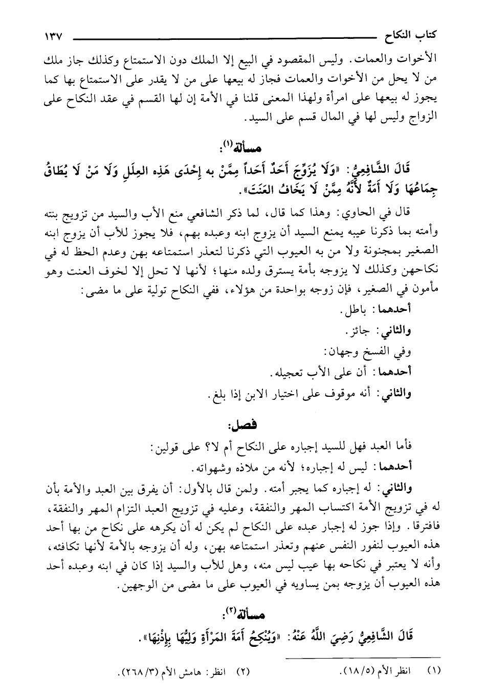 قَالَ الشَّافِعِيُّ رَضِيَُ اللهُ عَنْهُ: "وَيُنْكِحُ أَمَةَ المَرْأَةِ وَليُّهَا بِإِذْنِهَا ".