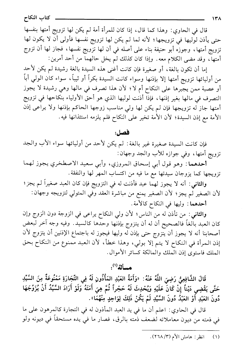 قَالَ الشَّافِعِيُّ رَضِيَُ اللهُ عَنْهُ: "وَأَمَةُ العَبْدِ المَاذُونِ لَهُ فِي التِّجَارَةِ مَمْنُوعَةٌ مِنَ السَّيِّدِ حَتَّى يَقْضِي دَيْناً إِنْ كَانَ عَلَيْهِ وَيُحْدِثَ لَهُ حَجْرًا ثُمَّ هِيَ أَمَتَهُ وَلَوْ أَرَادَ السَّيِّدُ أَنْ يُزَوِّجَهَا دُونَ العَبْد أَوْ العَبْدُ دُونَ السَّيِّدِ لَمْ يَكُنْ ذَبِكَ لِوَاحِدٍ مِنْهُمَا ".