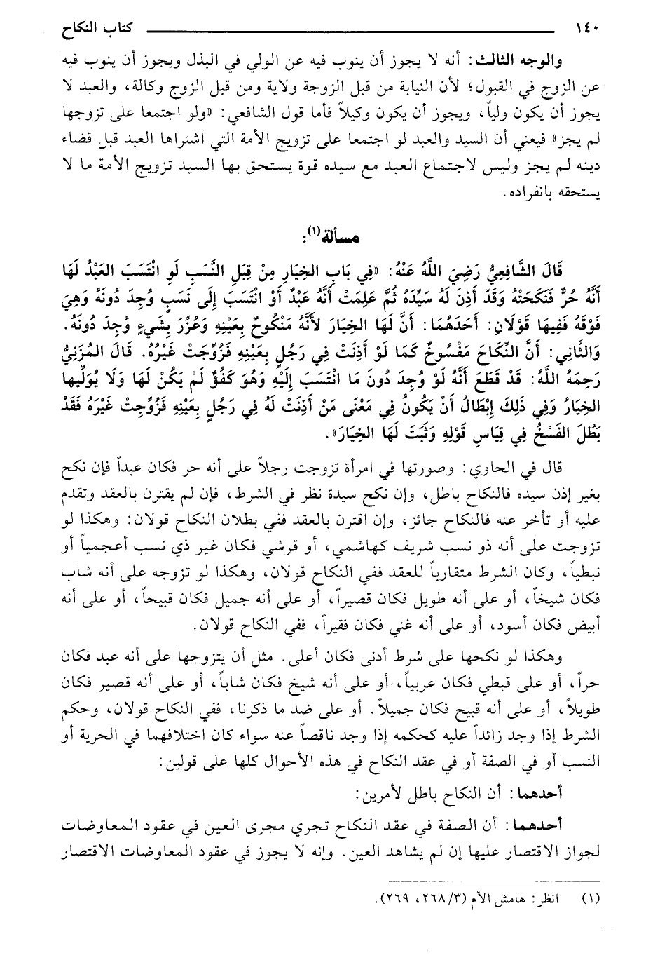 قَالَ الشَّافِعِيُّ رَضِيَُ اللهُ عَنْهُ: "فِي بَابِ الخيَارِ مِنْ النَّسَبِِ لَو انْتَسَبَ لَوِ انْتَسَبَ العَبْدُ لَهَا أَنَّهُ حُرُّ فَنَكَحَتْهُ وَقَدّ أَذِنَ لَهُ سَيِّدَهُ ثُمَّ عَلِمَتْ أَنَّهُ عَبْدٌ أّوْ انْتَسَبَ غِلَى نَسَبٍ وُجِدَ دُونَهُ وَهِيَ فَوْقَهُ فَفِيهَا قَولاَنِ: أحدهما: أَنَّ لَهَا الخِيَارَ لأَنَّهُ مَنْكُوحٌ بِعَيْنِهِ وّعُزِّرَ بَِشيء وُجِدَ دُونَهُ. وَالثَّانِي: أَنَّ النَّكَاحَ مَفْسُوحُ كَمَا لَوْ أَذِنَتْ في رَجُلِ بِعَيْنِهِ فَزُجَتْ غَيْرُُ. قَالً المُزَنِيٌّ رَحِمَهُ اللهُ: قَدْ قَطَعَ أَنَّهُ لَوْ وُجِدَ دُونَ مَا انْتَسَبَ إلَيْهِ وَهُوَ كَفُوٌ لَمْ يَكُنْ لَهَا وَلاَ يُوَلِّيها الخِيَارُ وَفِي ذَلِكَ إِبْطَالُ أَنْ يَكُونُ فِي مَعْنَى مَنْ أذِنَتْ لَهُ فِي رَجُلٍ بِعَيْنِه فَزُوَّجِتْ غَيْرَهُ فَقَدْ بَطُلَ الفَسْخُ فِي قِيَاسِ قَوْلِهِ وَثَبَتَ لَهَا الخيَارَ ".