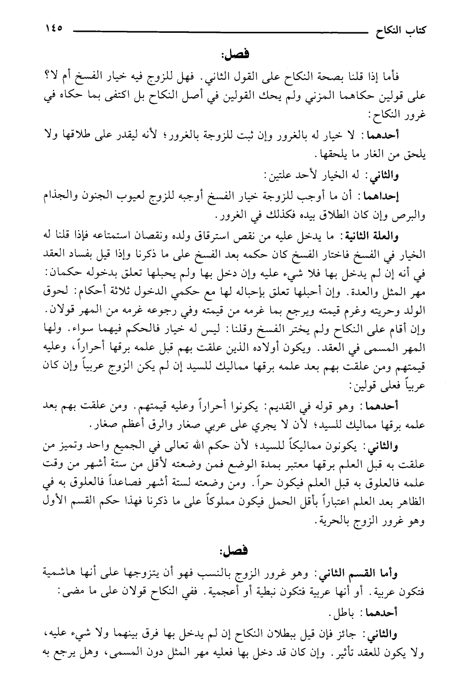 وأما القسم الثاني: وهو غرور الزوج بالنسب فهو أن يتزوجها على أنها هاشمية فتكون عربية. أو أنها عربية فتكون نبطية أو أعجمية. ففي النكاح قولان على ما مضي: