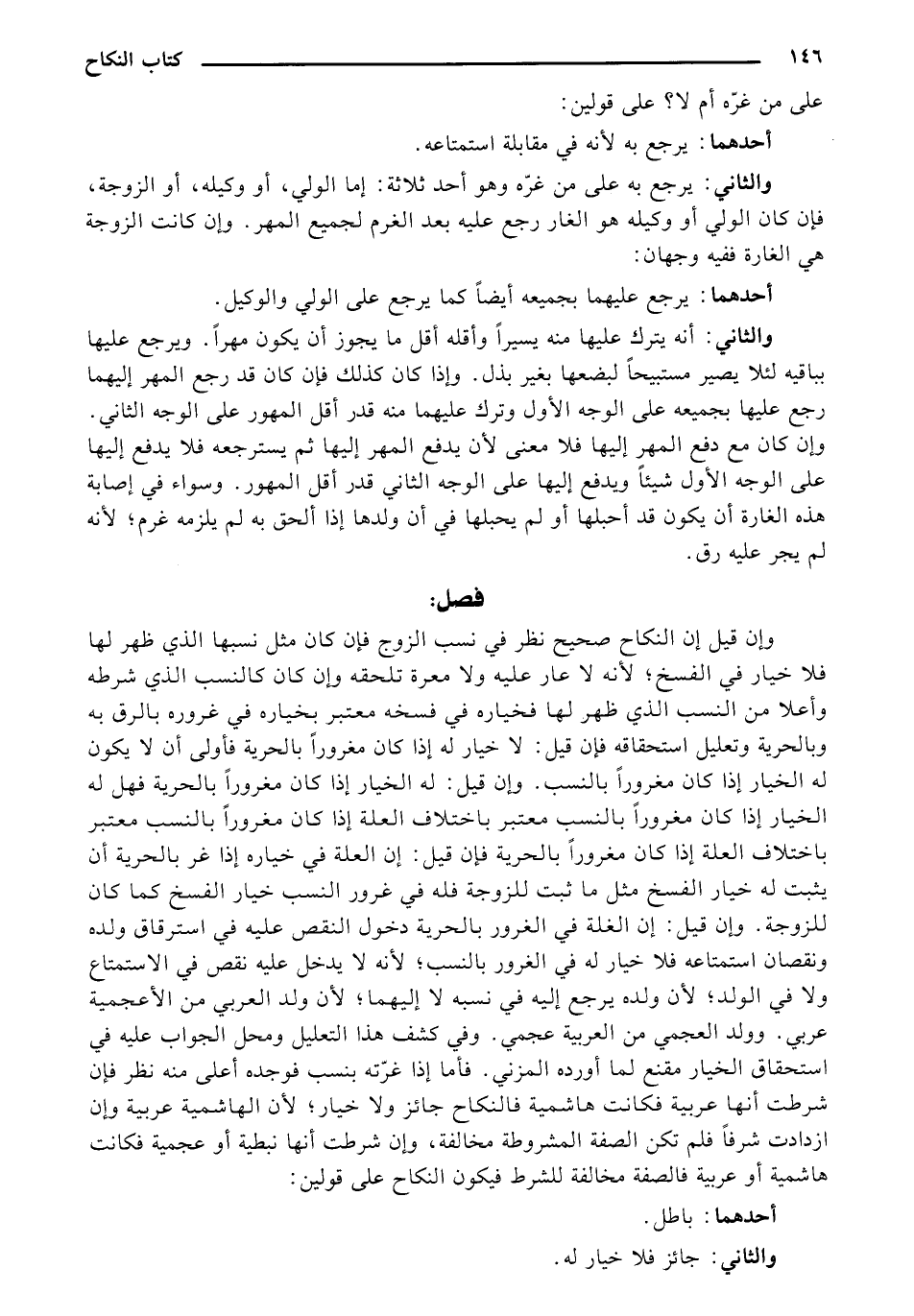 وإن قيل أن النكاح صحيح نظر في نسب الزوج فإن كان مثل نسبها الذي ظهر لها فلا خيار في الفسخ، لأنه لا عار عليه ولا معرة تلحقه وإن كان كالنسب الذي شرطه وأعلا من النسب الذي ظهر لها فخياره في فسخه معتبر بخياره في غروره بالرق به وبالحرية وتعليل استحقاقه فإن قيل: لا خيار له إذا كان مغرورًا بالحرية فأولى أن لا يكون له الخيار إذا كان مغرورًا بالنسب. وإن قيل: له الخيار إذا كان مغرورًا بالحرية فهل له الخيار إذا كان مغرورًا بالنسب معتبر باختلاف العلة إذا كان مغرورًا بالنسب معتبر باختلاف العلة إذا كان مغرورًا بالحرية فإن قيل: إن العلة في خياره إذا غر بالحرية أن يثبت له خيار الفسخ مثل ما ثبت للزوجة فله في غرور النسب خيار الفسخ كما كان للزوجة. وإن قيل: إن الغلة في الغرور بالحرية دخول النقص عليه في استرقاق ولده ونقصان استمتاعه فلا خيار له في الغرور بالنسب، لأنه لا يدخل عليه نقص في الاستمتاع ولا في الولد، لأن ولده يرجع إليه في نسبه لا إليهما، لأن ولد العربي من الأعجمية عربي. وولد العجمي من العربية عجمي. وفي كشف هذا التعليل ومحل الجواب عليه في استحقاق الخيار مقنع لما أورده المزني. فأما إذا غرّته بنسب فوجده أعلى منه نظر فإن شرطت أنها عربية فكانت هاشمية فالنكاح جائز ولا خيار، لأن الهاشمية عربية وإن ازدادت شرفًا فلم تكن الصفة المشروطة مخالفة، وإن شرطت أنها نبطية أو عجمية فكانت هاشمية أو عربية فالصفة مخالفة للشرط فيكون النكاح على قولين: