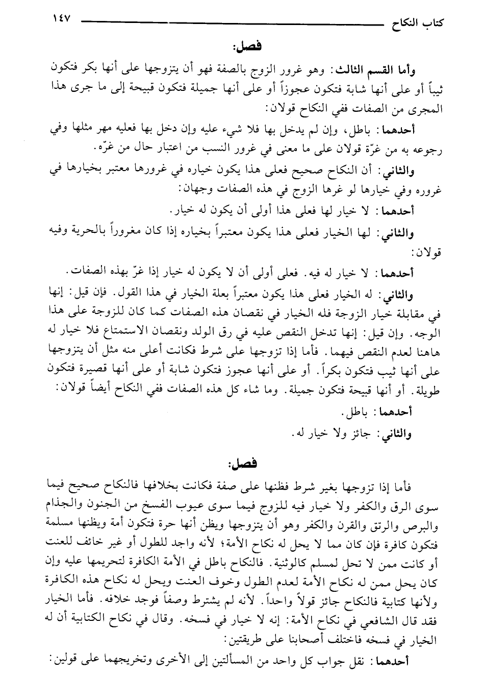 وأما القسم الثالث: وهو غرور الزوج بالصفة فهو أن يتزوجها على أنها بكر فتكون ثيبًا أو على أنها شابة فتكون عجوزًا أو على أنها جميلة فتكون قبيحة إلى ما جرى هذا المجرى من الصفات ففي النكاح قولان: