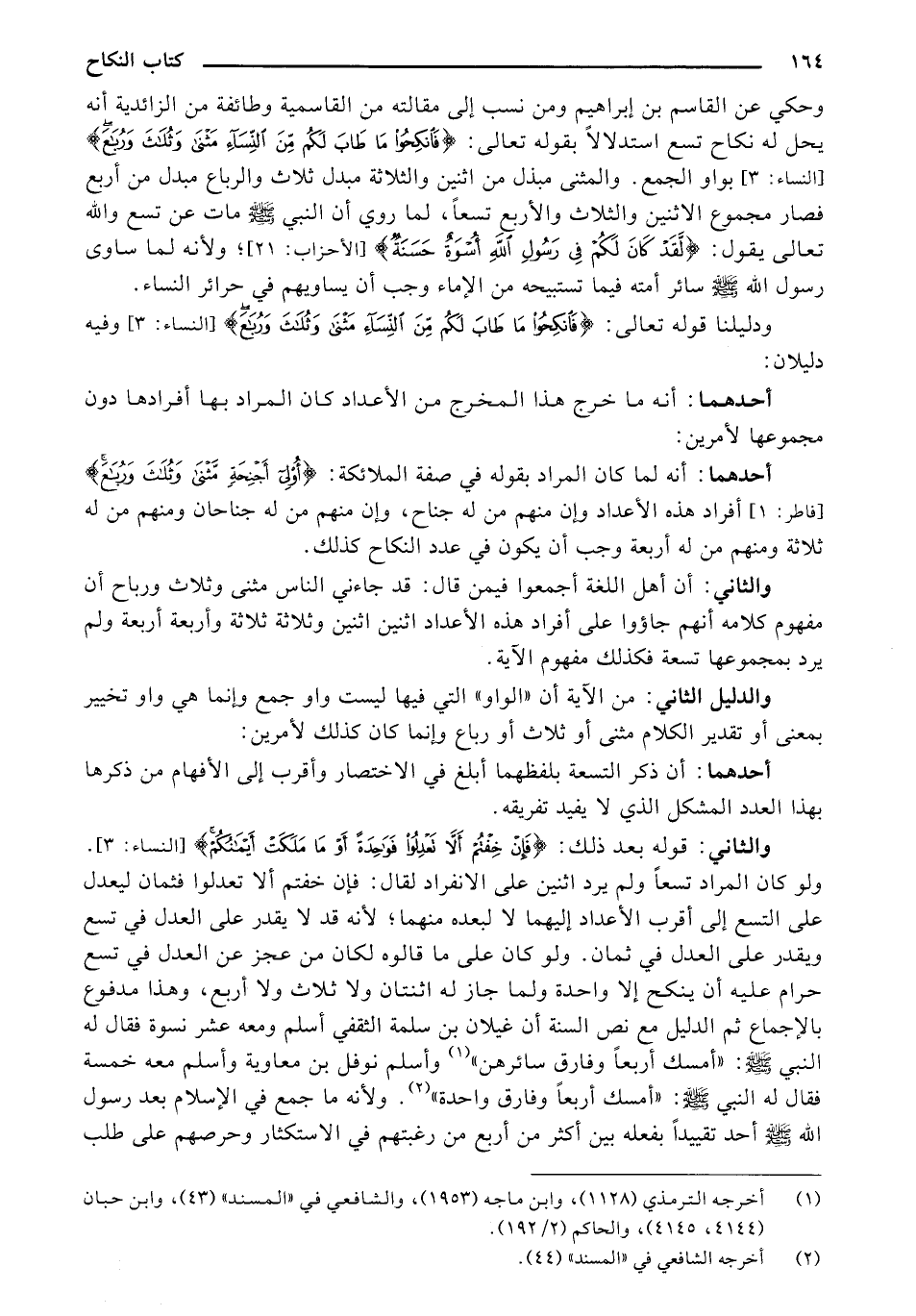 وحكي عن القاسم بن إبراهيم ومن نسب إلى مقالته من القاسمية وطائفة من الزائدية أنه يحل له نكاح تسع استدلالاً بقوله تعالى: {فَانكِحُوا مَا طَابَ لَكُم مِّنَ النِّسَاءِ مَثْنَى وثُلاثَ ورُبَاعَ} [النساء: 3] بواب الجمع. والمثنى مبذل من اثنين والثلاثة مبدل ثلاث والرابع مبدل من أربع فصار مجموع الاثنين والثلاث والأربع تسعاً، لما روي أن النبي صلى الله عليه وسلم مات عن تسع والله تعالى يقول: {لَقَدْ كَانَ لَكُمْ فِي رَسُولِ اللَّهِ أُسْوَةٌ حَسَنَةٌ} [الأحزاب: 21]، ولأنه لما ساوى رسول الله صلى الله عليه وسلم سائر أمته فيما تستبيحه من الإماء وجب أن يساويهم في حرائر النساء.