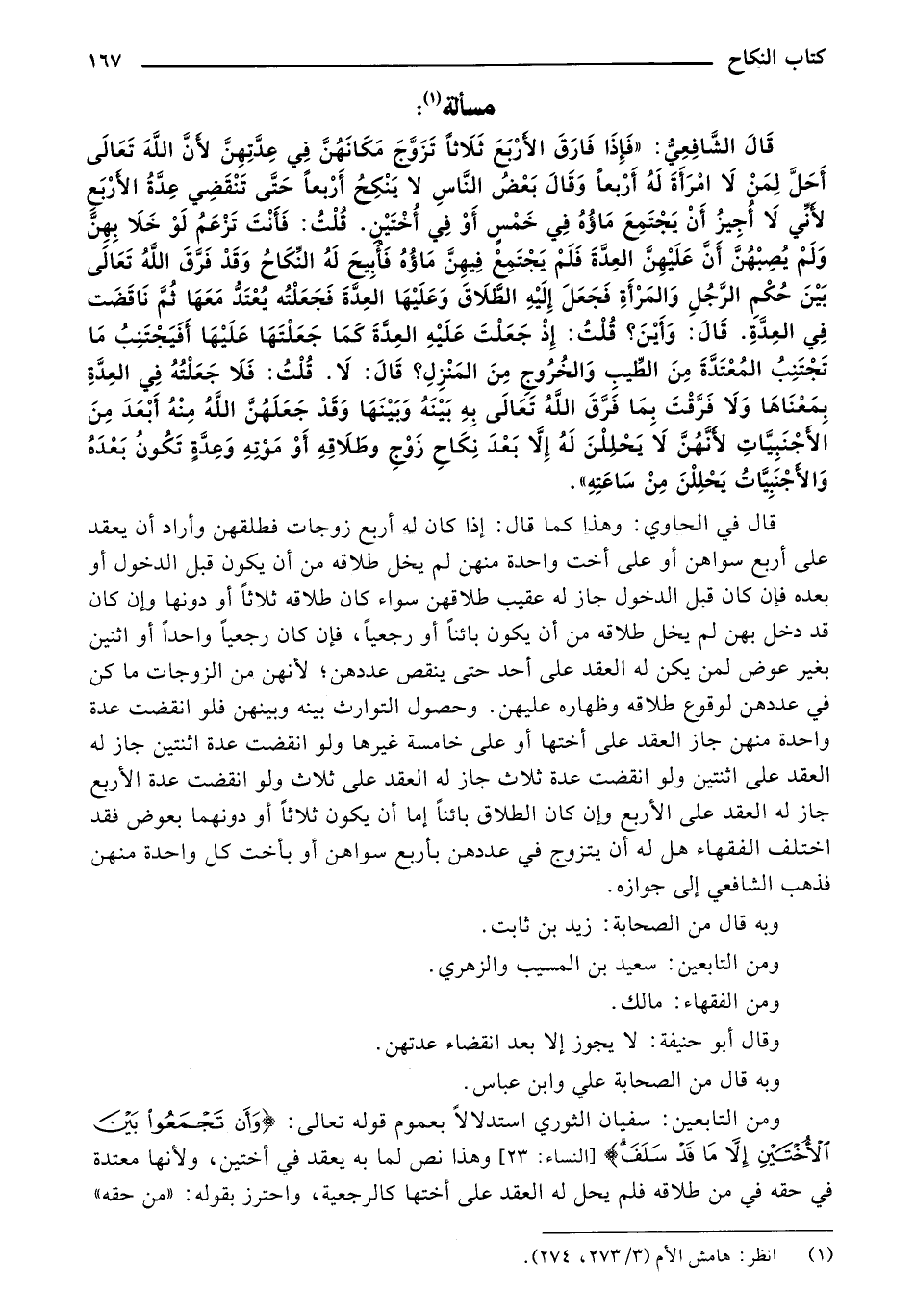 قال الشافعي: "فإذا فارق الأربع ثلاثاً تزوج مكانهن في عدتهن لأن الله تعالى أحل لمن لا امرأة له أربعاً وقال بعض الناس لا ينكح أربعاً حتى تنقضي عدة الأربع لأني لا أجيز أن يجتمع ماؤه في خمس أو في أختين. قلت: فأنت تزعم لو خلا بهن ولم يصبهن أن عليهن العدة فلم يجتمع فيهن ماؤه فأبيح له النكاح وقد فرق الله تعالى بين حكم الرجل والمرأة فجعل إليه الطلاق وعليها العدة فجعلته يعتد معها ثم ناقضت في العدة. قال: وأين؟ قلت: إذ جعلت عليه العدة كما جعلتها عليها أفيجتنب ما تجتنب المعتدة من الطيب والخروج من المنزل؟ قال: لا. قلت: فلا جعلته في العدة بمعناها ولا فرقت بما فرق الله تعالى به بينه وبينها وقد جعلهن الله منه أبعد من الأجنبيات لأنهن لا يحللن له إلا بعد نكاح زوج وطلاقه أو مؤته وعدة تكون بعده والأجنبيات يحللن من ساعته".