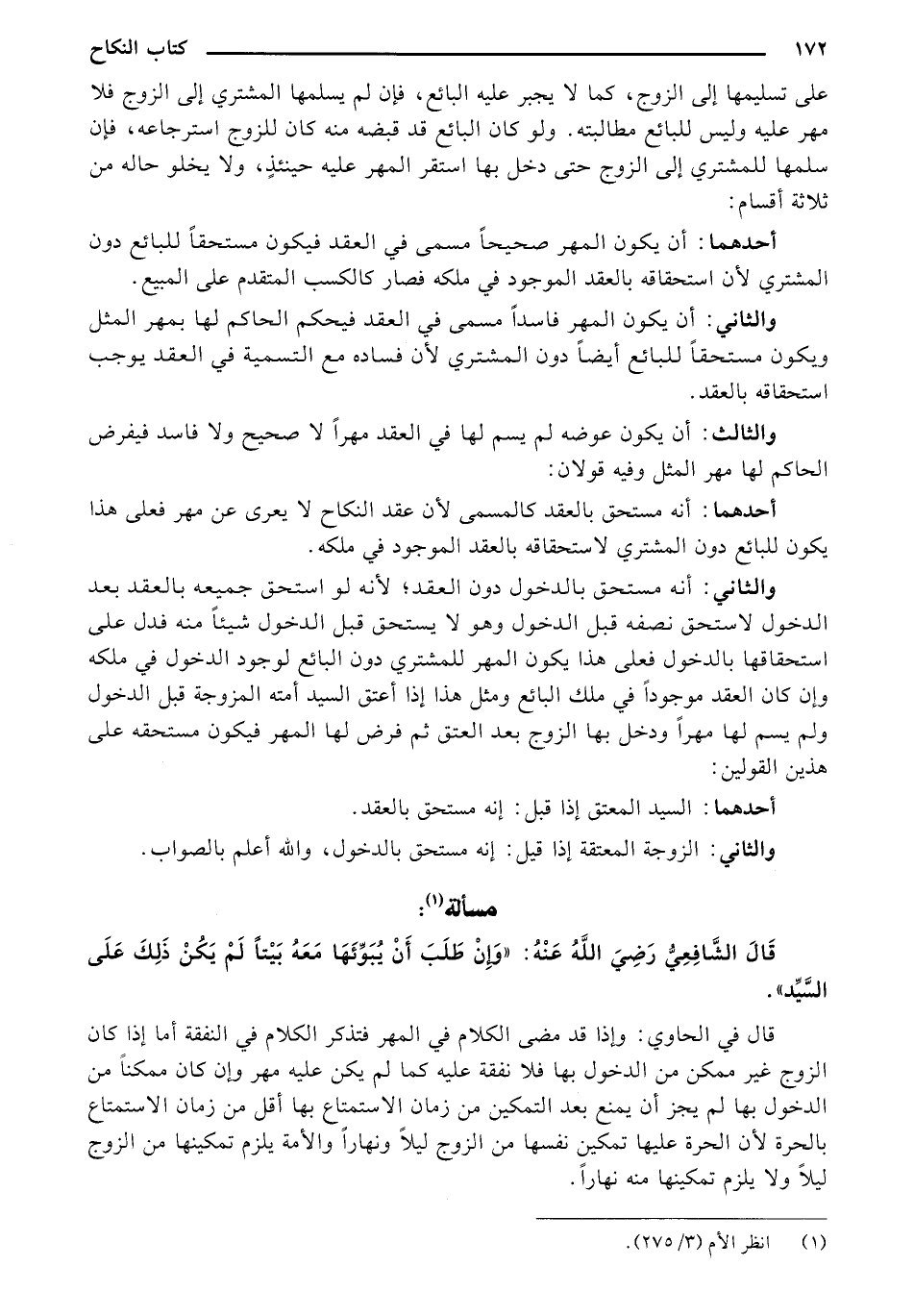 قَالَ الشَّافِعِيُّ رَضِيَ اللهُ عَنْهُ: "وَاِنْ طَلَبَ أَنْ يُبَوَّئَهَا مَعَهُ بَيْتًا لَمْ يَكُنْ ذَلِكَ عَلَى السَّيَّد".