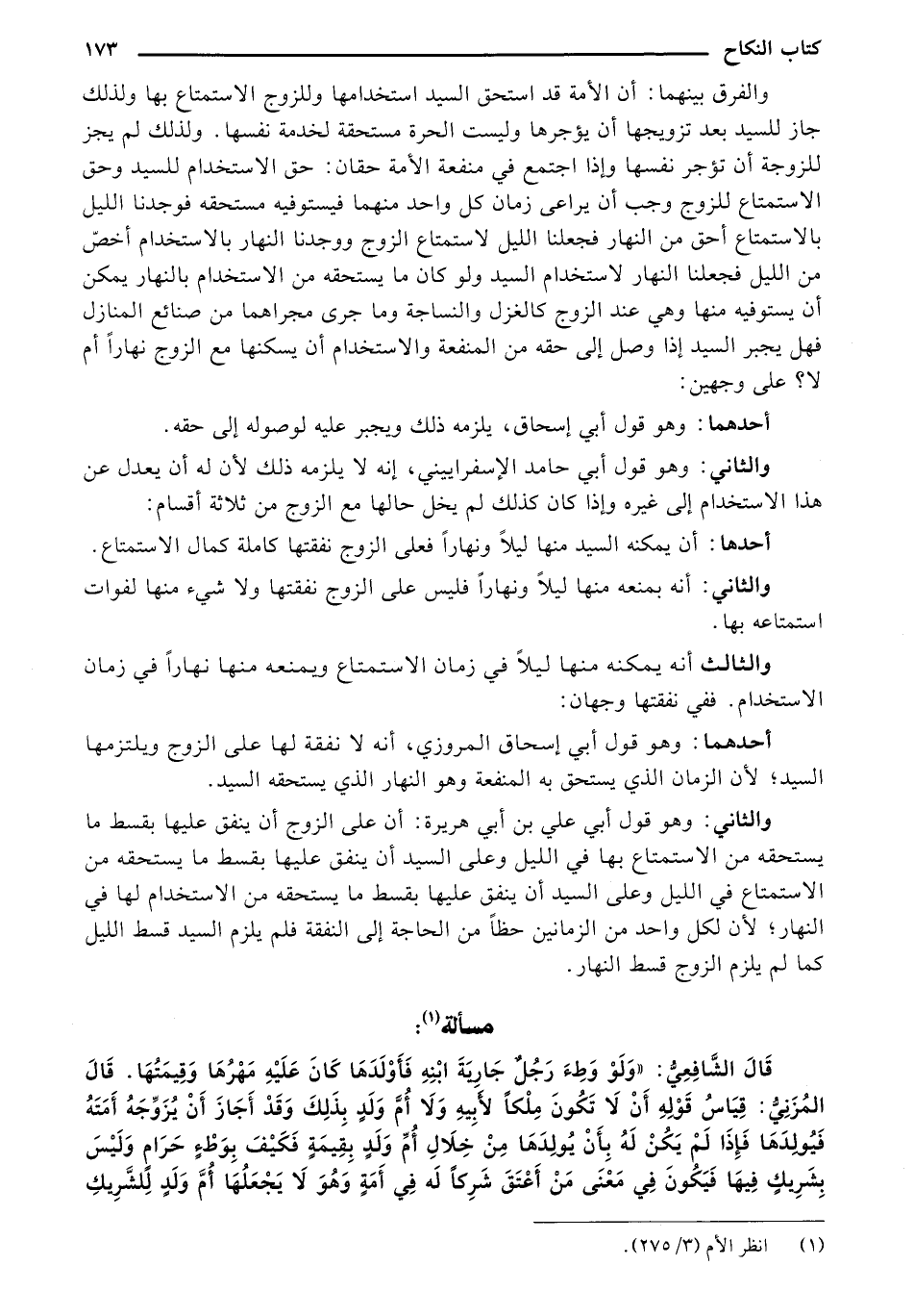 والفرق بينهما: أن الأمة قد استحق السيد استخدامها وللزوج الاستمتاع بها ولذلك جاز للسيد بعد تزويجها أن يؤجرها وليست الحرة مستحقة لخدمة نفسها. ولذلك لم يجز للزوجة أن تؤجر نفسها وإذا اجتمع في منفعة الأمة حقان: حق الاستخدام لليد وحق الاستمتاع للزوج وجب أن يراعى زمان كل واحد منهما فيستوفيه مستحقه فوجدنا الليل بالاستمتاع أحق من النهار فجعلنا الليل لاستمتاع الزوج ووجدنا النهار بالاستخدام أخص من الليل فجعلنا النهار لاستخدام السيد ولو كان ما يستحقه من الاستخدام بالنهار يمكن أن يستوفيه منها وهي عند الزوج كالغزل والنساجة وما جرى مجراهما من صنائع المنازل فهل يجبر السيد إذا وصل إلى حقه من المنفعة والاستخدام أن يسكنها مع الزوج نهارا أم لا؟ على وجهين: