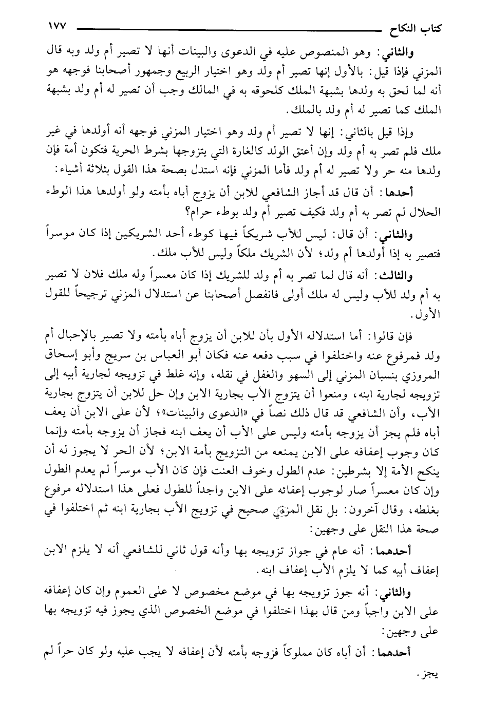 فإن قالوا: أما استدلاله الأول بأن للابن أن يزوج أباه بأمته ولا تصير بالإحبال أم ولد فمرفوع عنه واختلفوا في سبب دفعه عنه فكان أبو العباس بن سريج وأبو إسحاق المروزي بنسبان المزني إلى السهو والغفل في نقله، وانه غلط في تزويجه لجارية أبيه إلى تزويجه لجارية ابنه، ومنعوا أن يتزوج الأب بجارية الابن وإن حل للابن أن يتزوج بجارية الأب، وأن الشافعي قد قال ذلك نصا في "الدعوى والبينات"؛ لأن على الابن أن يعف أباه فلم يجز أن يزوجه بأمته وليس على الأب أن يعف ابنه فجاز أن يزوجه بأمته وإنما كان وجوب إعفافه على الابن يمنعه من التزويج بأمة الابن؛ لأن الحر لا يجوز له أن ينكح الأمة إلا بشرطين: عدم الطول وخوف العنت فإن كان الأب موسرا لم يعدم الطول وان كان معسرا صار لوجوب إعفائه على الابن واجدا للطول فعلى هذا استدلاله مرفوع بغلطه، وقال آخرون: بل نقل المزنى صحيح في تزويج الأب بجارية ابنه ثم اختلفوا في صحة هذا النقل على وجهين: